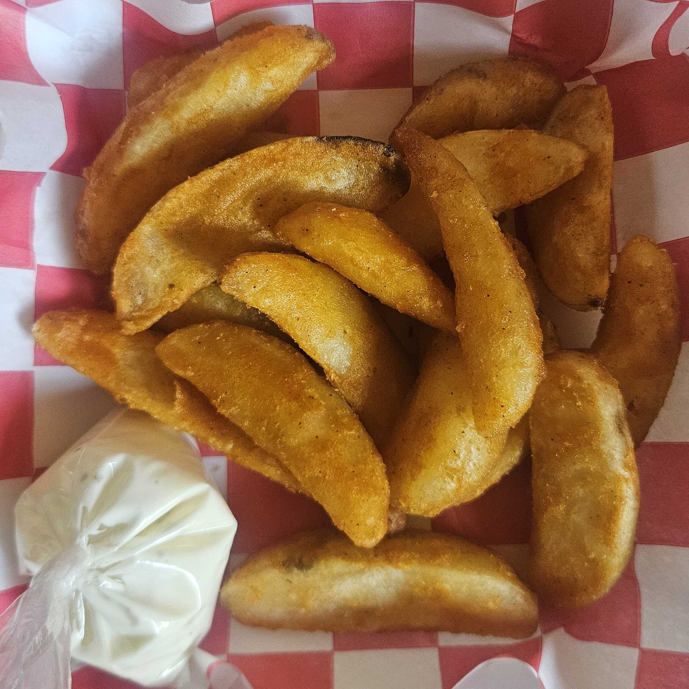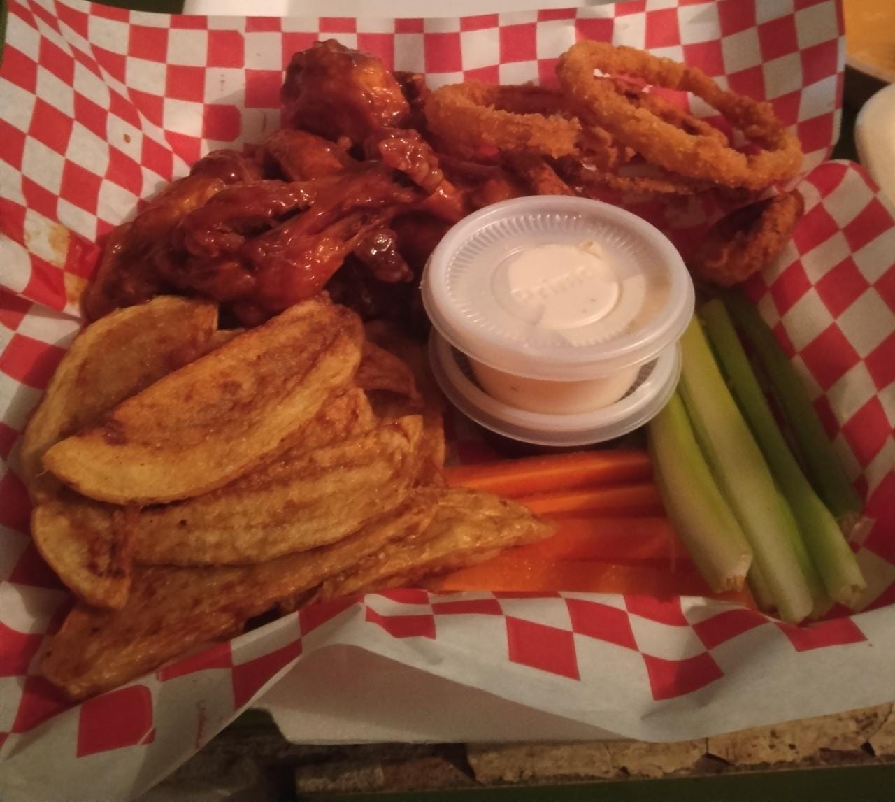 18 alitas, 1 orden de papas francesa o gajo y 5 dedos de queso acompañados de salsa ranch, zanahoria, apio, crema y catsup