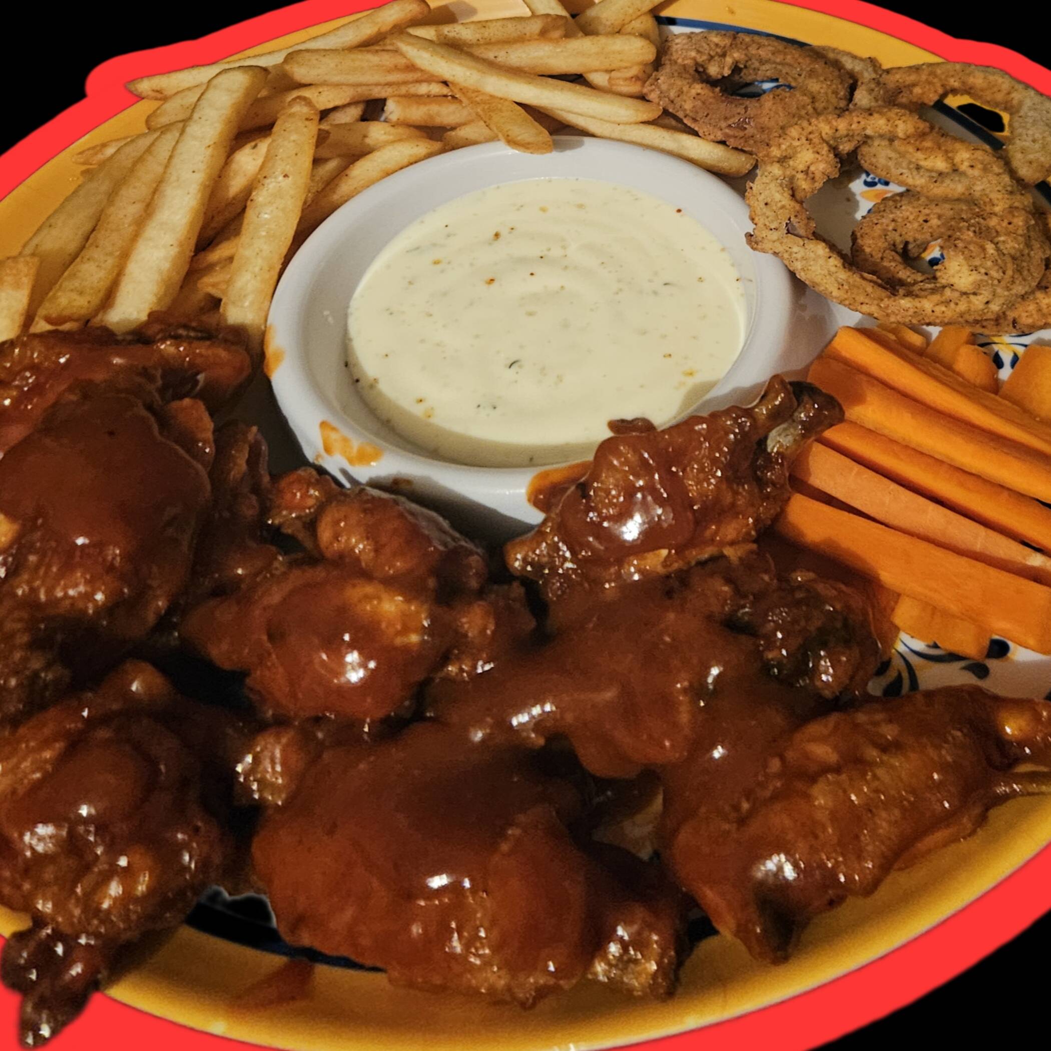 Alitas bañados con salsa de tu preferencia acompañados de salsa ranch y zanahoria