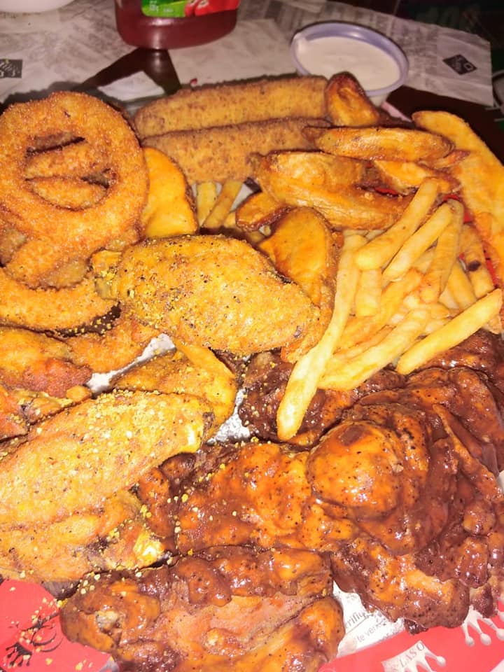 1 Kg de alitas O 1 kg de deshuesados, acompañado de papas fritas, papas gajo, nuggets, dedos de queso y aros de cebolla.