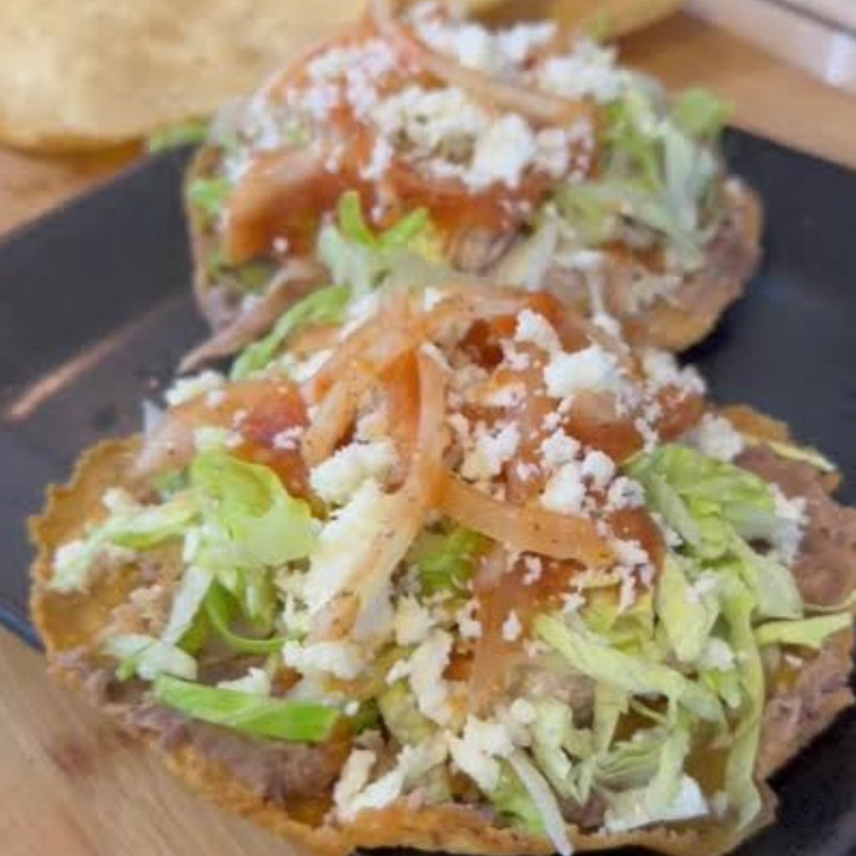 Tostada con frijoles, pollo, lechuga, zanahoria, cebolla, bañada en salsa de la casa