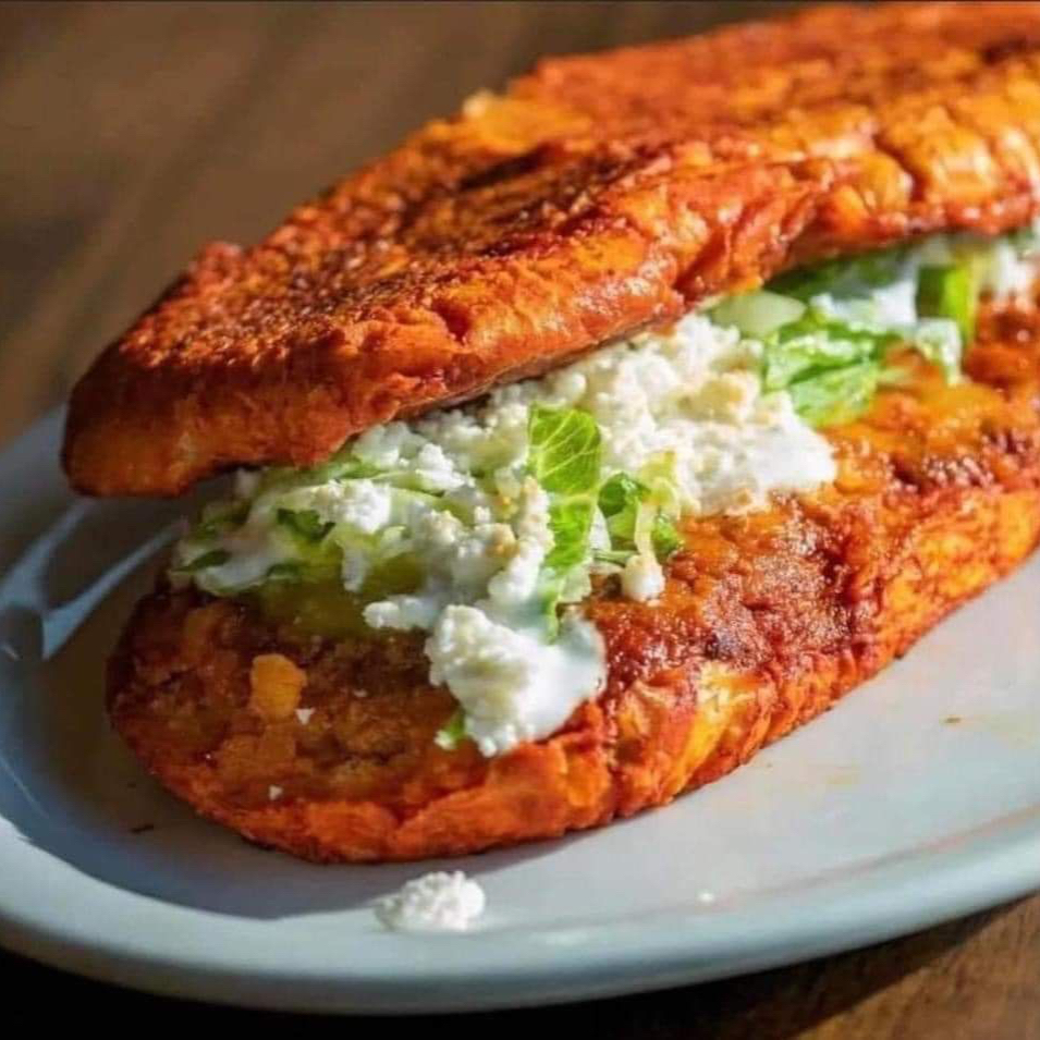 Bolillo bañado en salsa de guajillo, relleno de chorizo con papa, lechuga, crema y queso