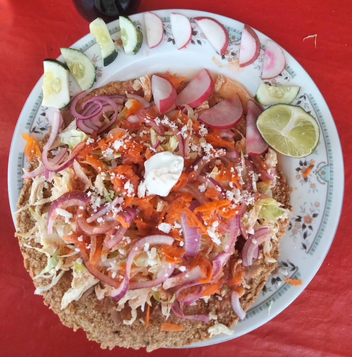 Es tostada grande estilo flamingo con lechuga, cebolla, zanahoria, queso y crema