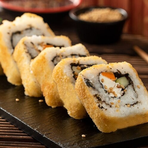 Rollo de arroz empanizado con ingrediente a elegir ademas de aguacate y zanahoria