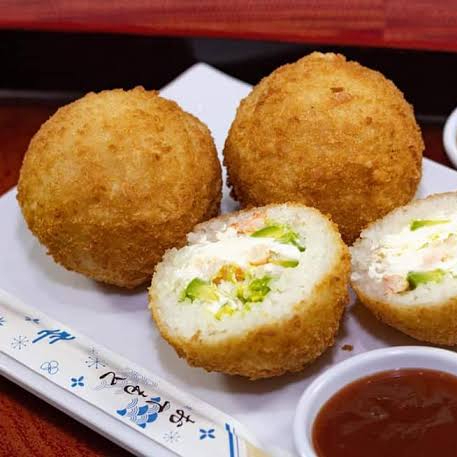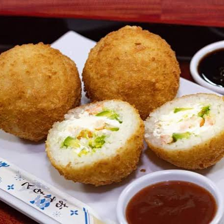 bolas de arroz empanizadas con un ingrediente a elegir, además de queso philadelphia acompañadas de zanahoria rayada