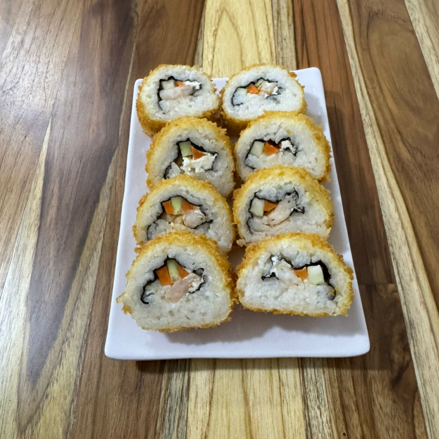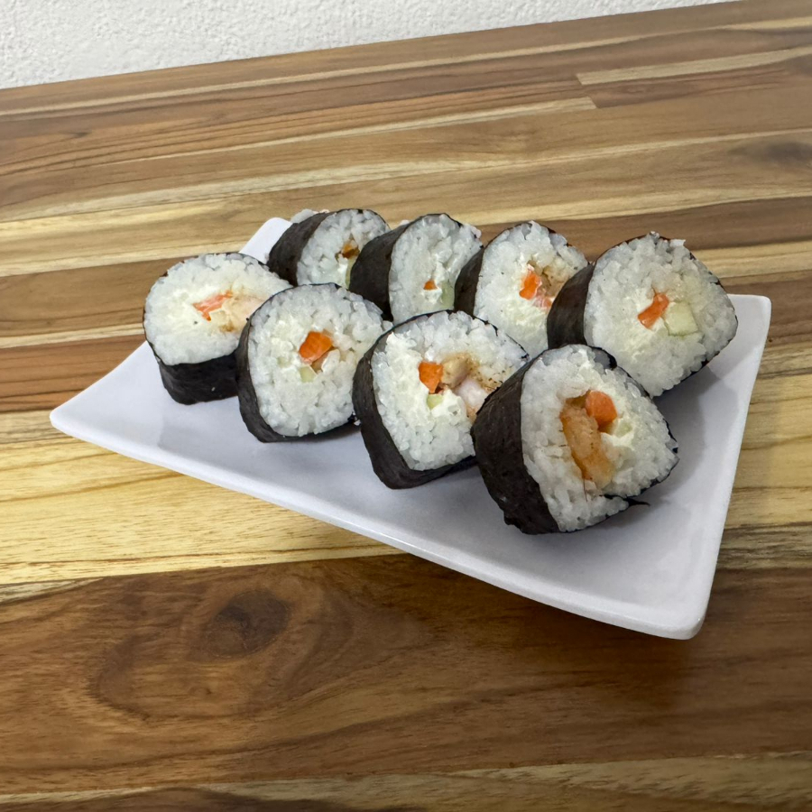 Con camarón y carne de res por dentro y alga nori por fuera.