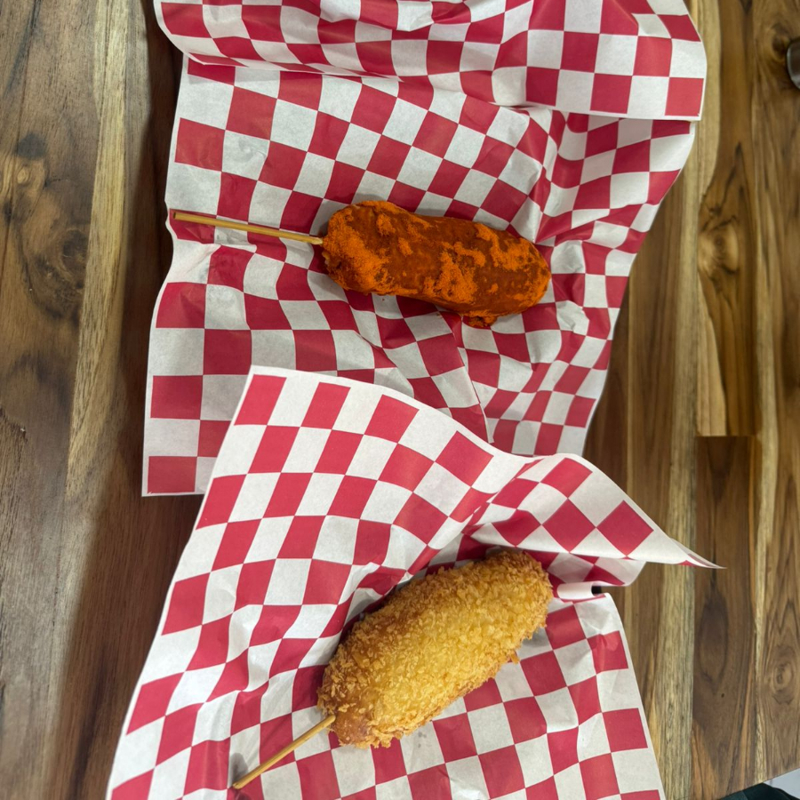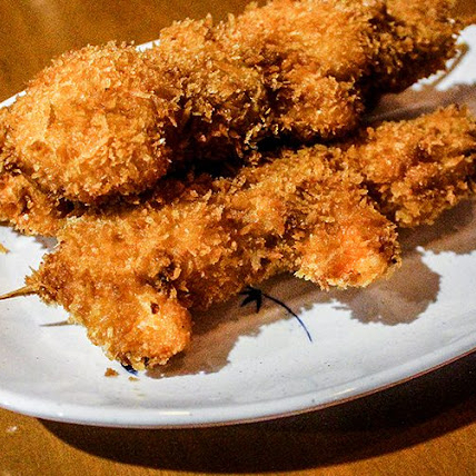 Con camarón y carne de res por dentro y empanizado por fuera.