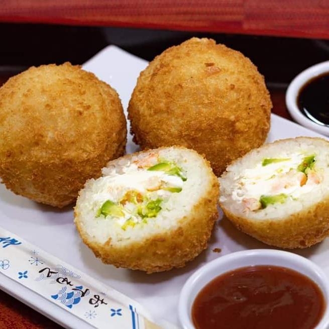 3 Bolas de arroz empanizada con carne de res y camarones.