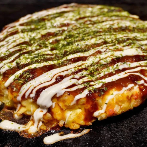 Pizza japonesa, mezcla de col con queso, harina, camaron y calamar