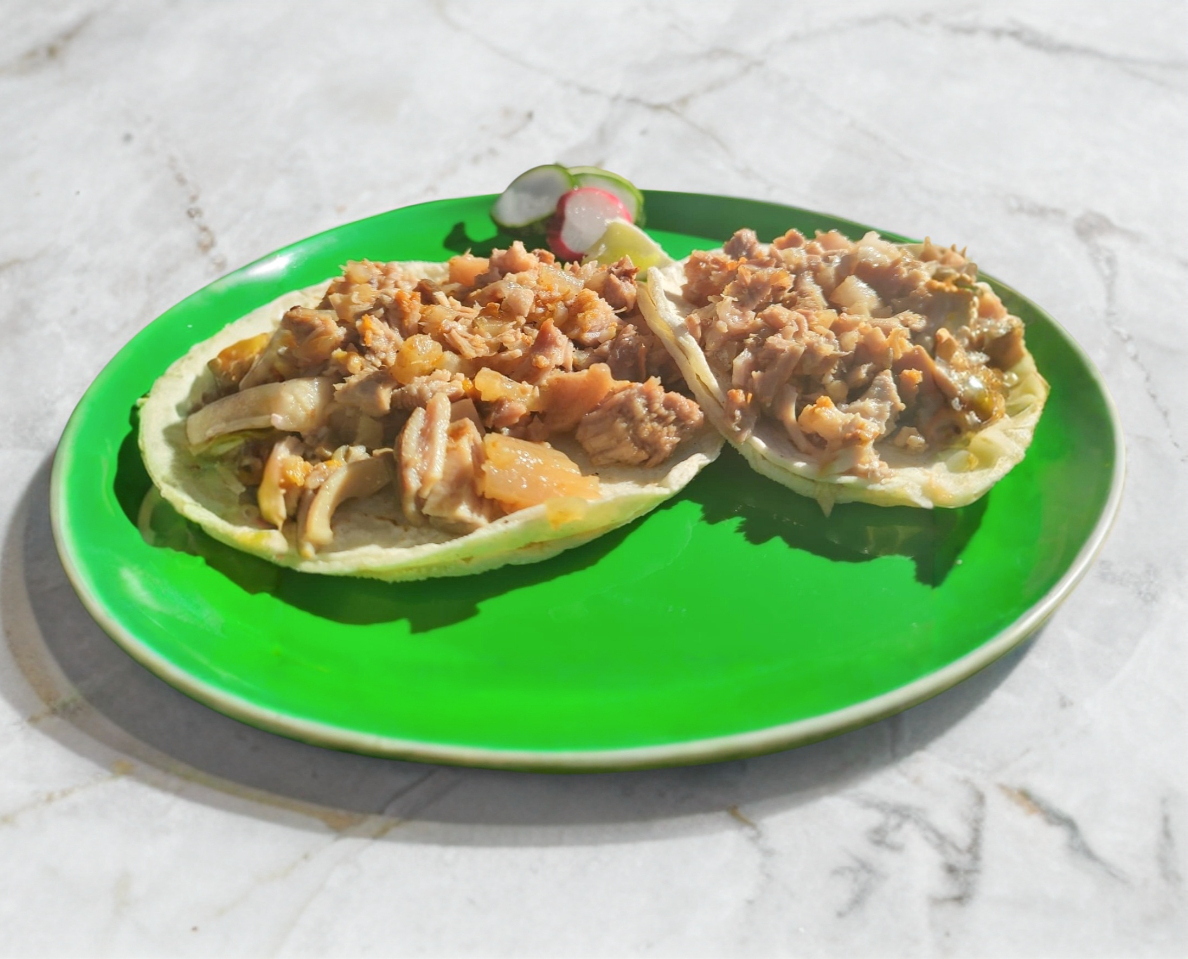 Doble tortilla de maíz con carne de puerco y cuero de cerdo acompañado de salsas especiales de la casa