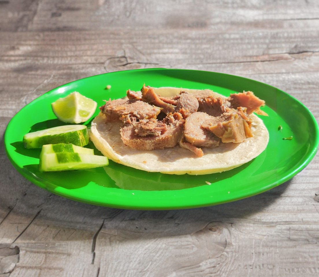 Doble Tortilla de maíz con carne de cerdo, buche, trompa, cuero y lengua