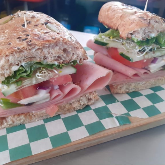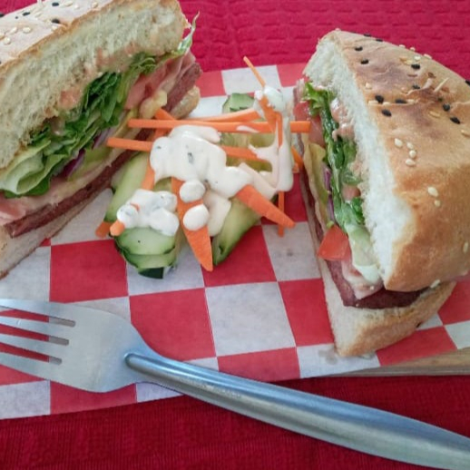 Pan integral, pollo a la plancha, jamon de pavo, queso asadero, aguacate, lechuga, jitomate y cebolla acmpañado de aderezo y guarnicion de pepino y zanahoria