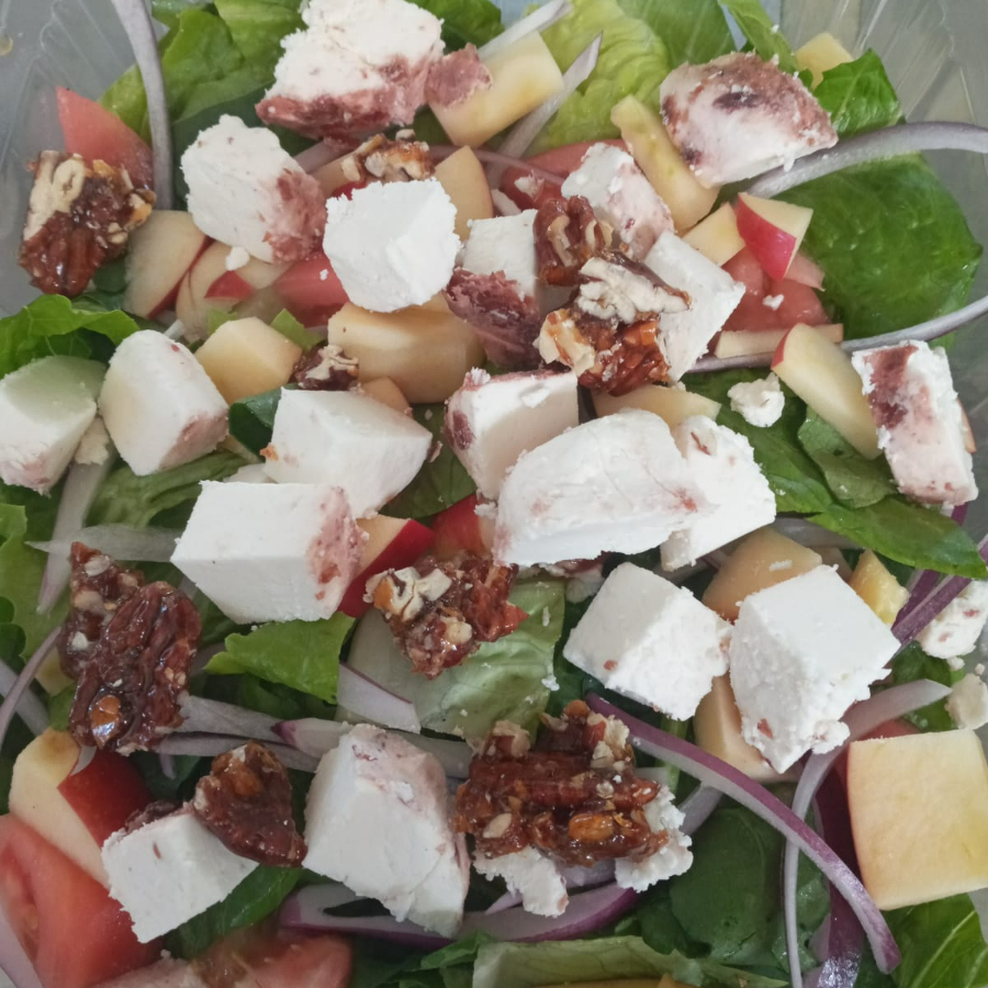 BASE DE LECHUGA, 1 PROTEINA A ELEGIR, MANZANA ROJA, CEBOLLA MORADA, JITOMATE, ESPINACA, Y NUEZ CARAMELIZADA