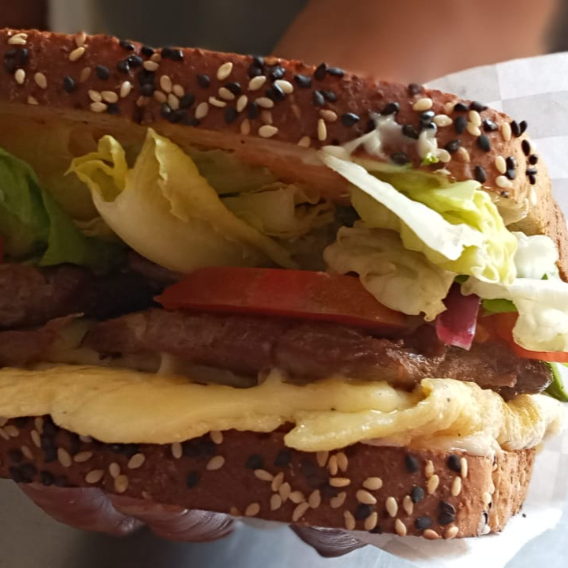 Pan integral, filete de res, queso asadero, huevo tipo omelette, aguacate, lechuga, jitomate,cebolla