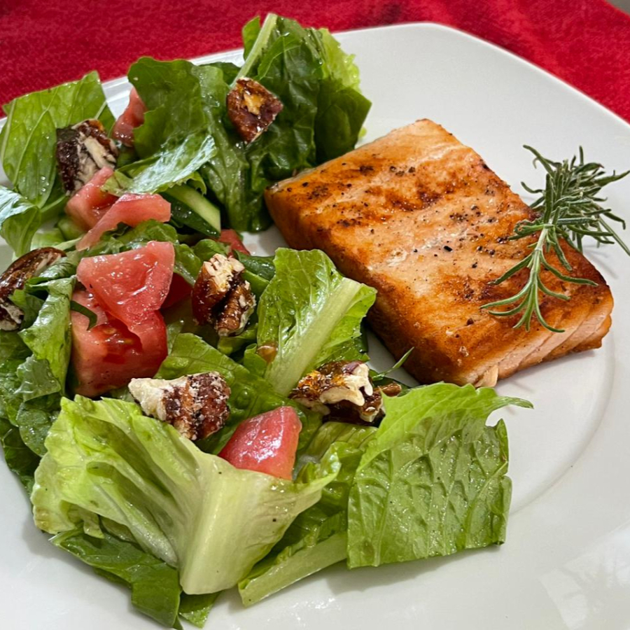 250gr de salmon a la plancha, bañado en vinagreta de moztasa dulce acompañado de una ensalada, lechuga, jitomate, nuez caramelizada
