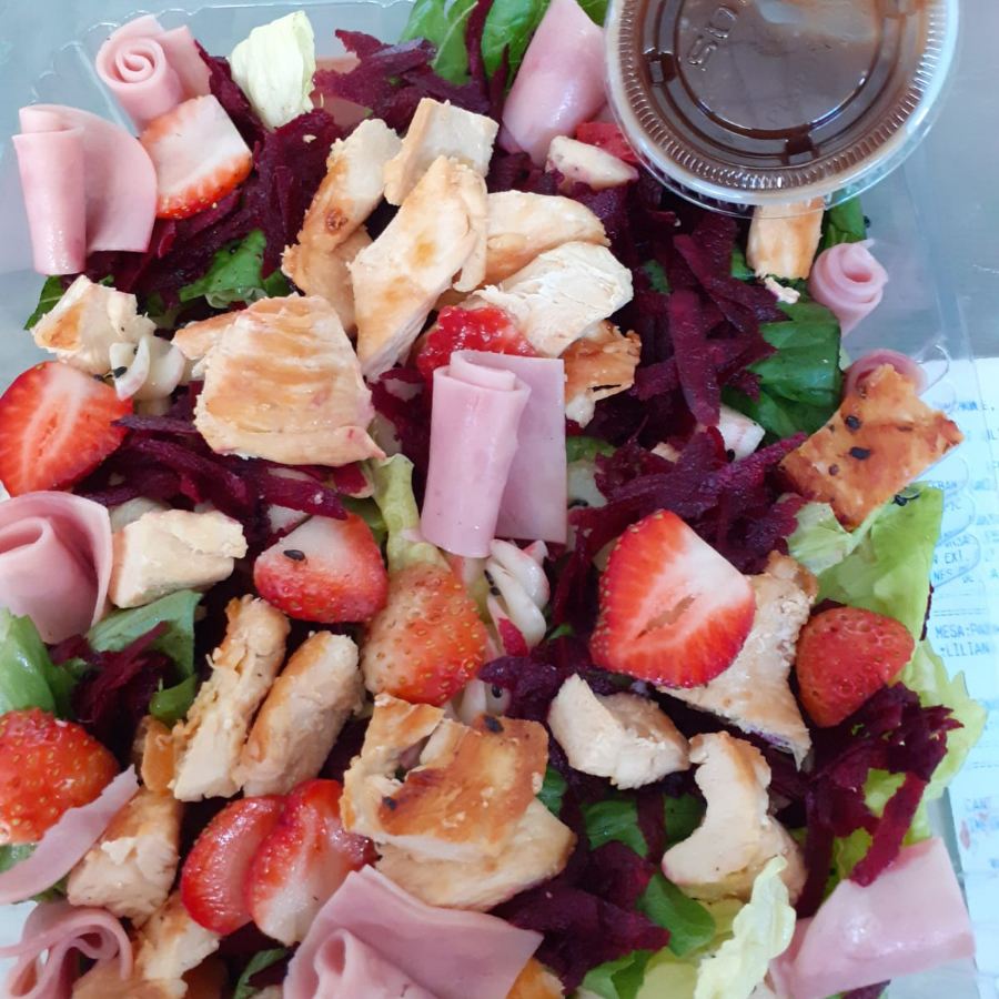 BASE DE LECHUGA, 1 PROTEINA A ELEGIR, MANZANA VERDE, APIO, VETABEL, ARANDANO, FRESA, AJONJOLI NEGRO, ACOMPAÑADO DE ADEREZO
