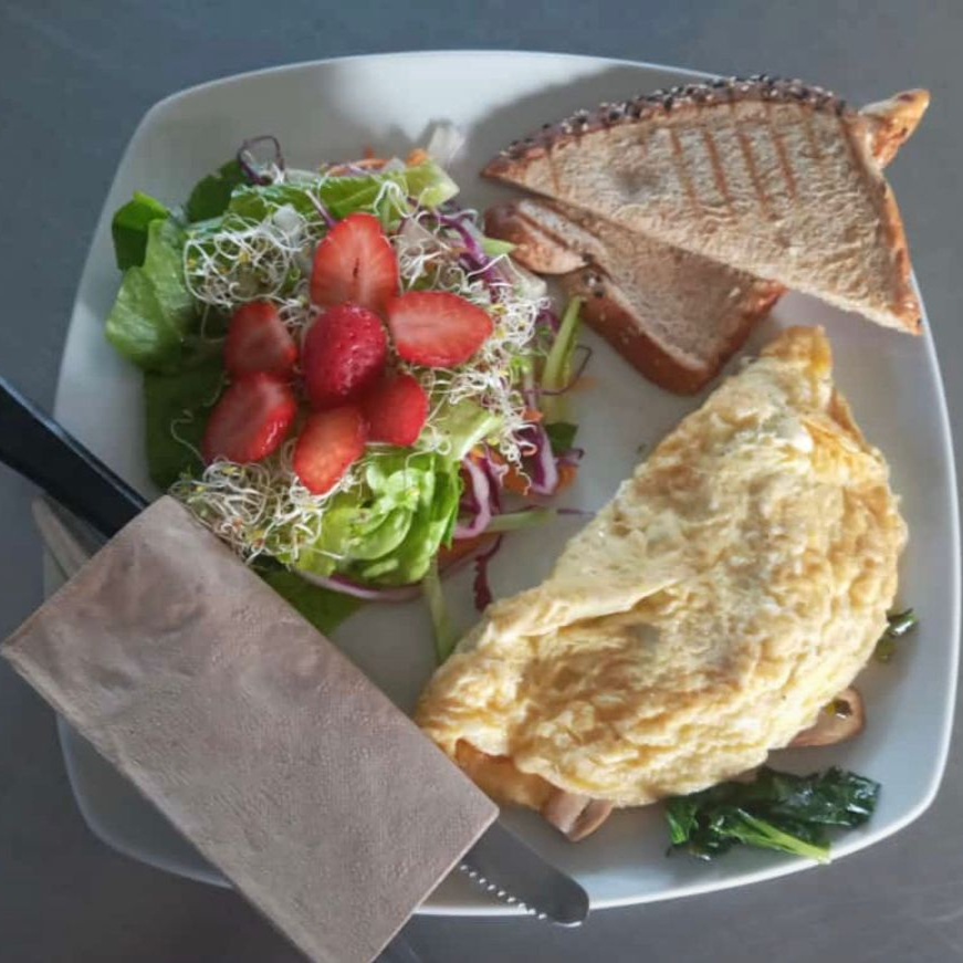 Huevo y clara de huevo, panela ó jamón, chile morrón, jitomate, cebolla, espinaca y champiñón guisados, acompañados de pan tostado y ensalada de lechuga, col morada, zanahoria, pepino,