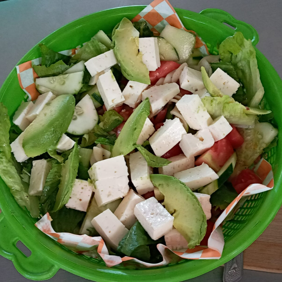 BASE DE LECHUGA, 1 PROTEINA A ELEGIR, JITOMATE, HOJAS DE ALBACA, PEPINO Y AGUACATE