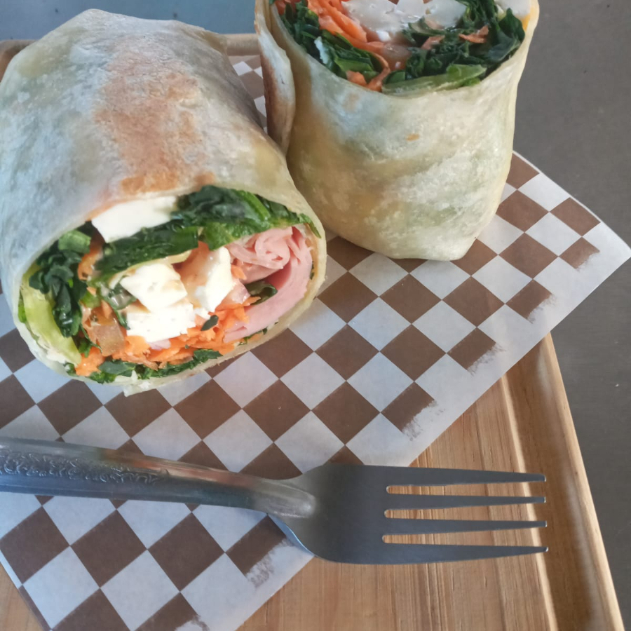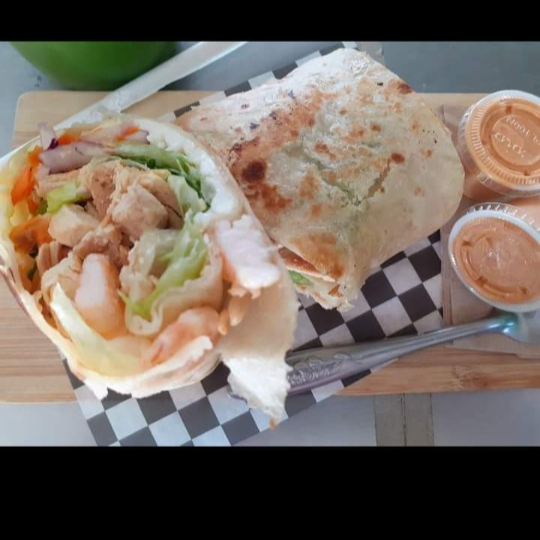 Tortilla de harina, 200gr pechuga a la plancha, queso asadero, lechuga, col morada, champiñon, morron, cebolla morada, y aderezo