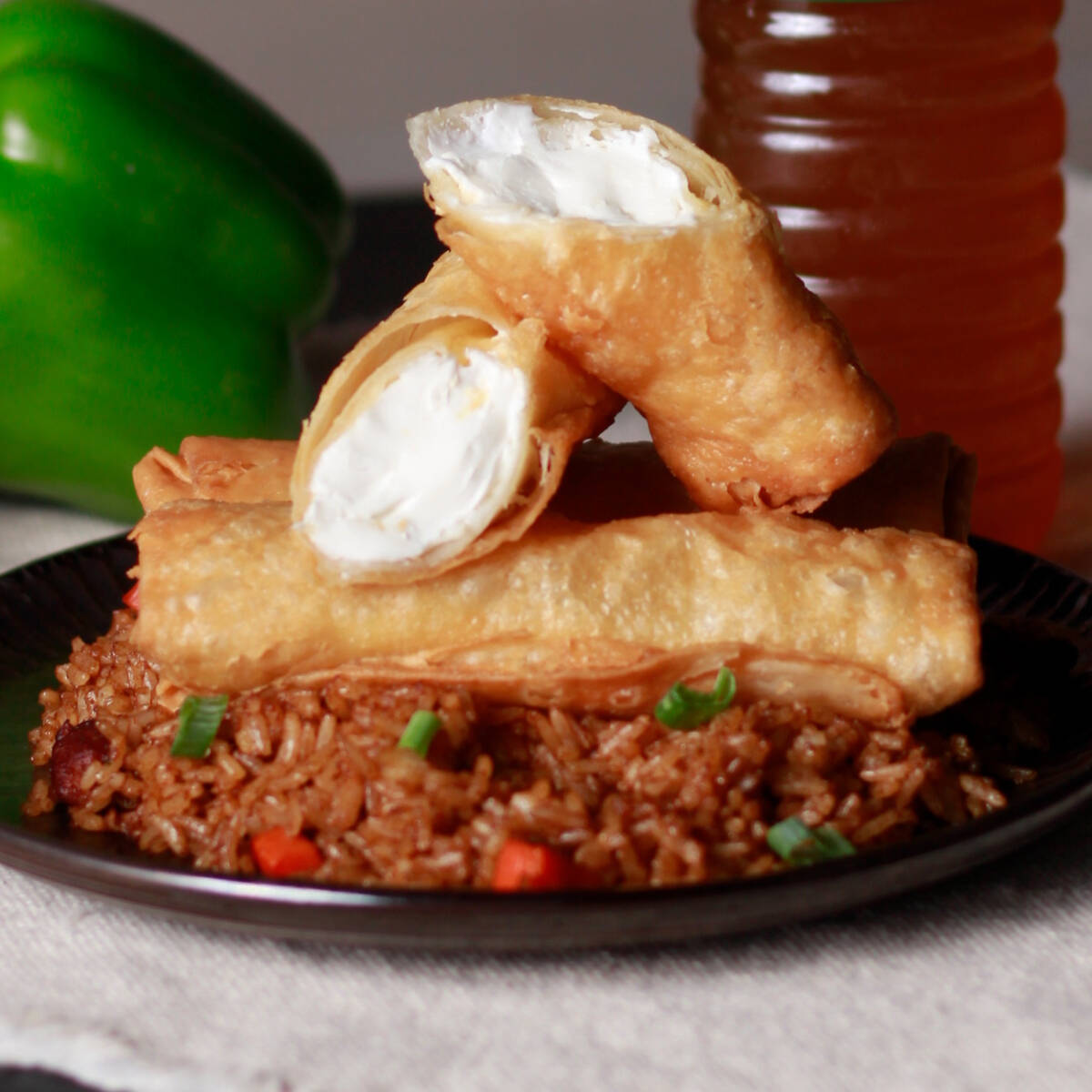 Cama de arroz frito, 3 rollos Camaron (aderezo de queso y camarón) y bebida a elegir.