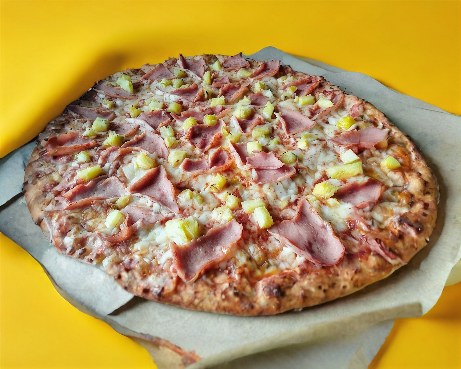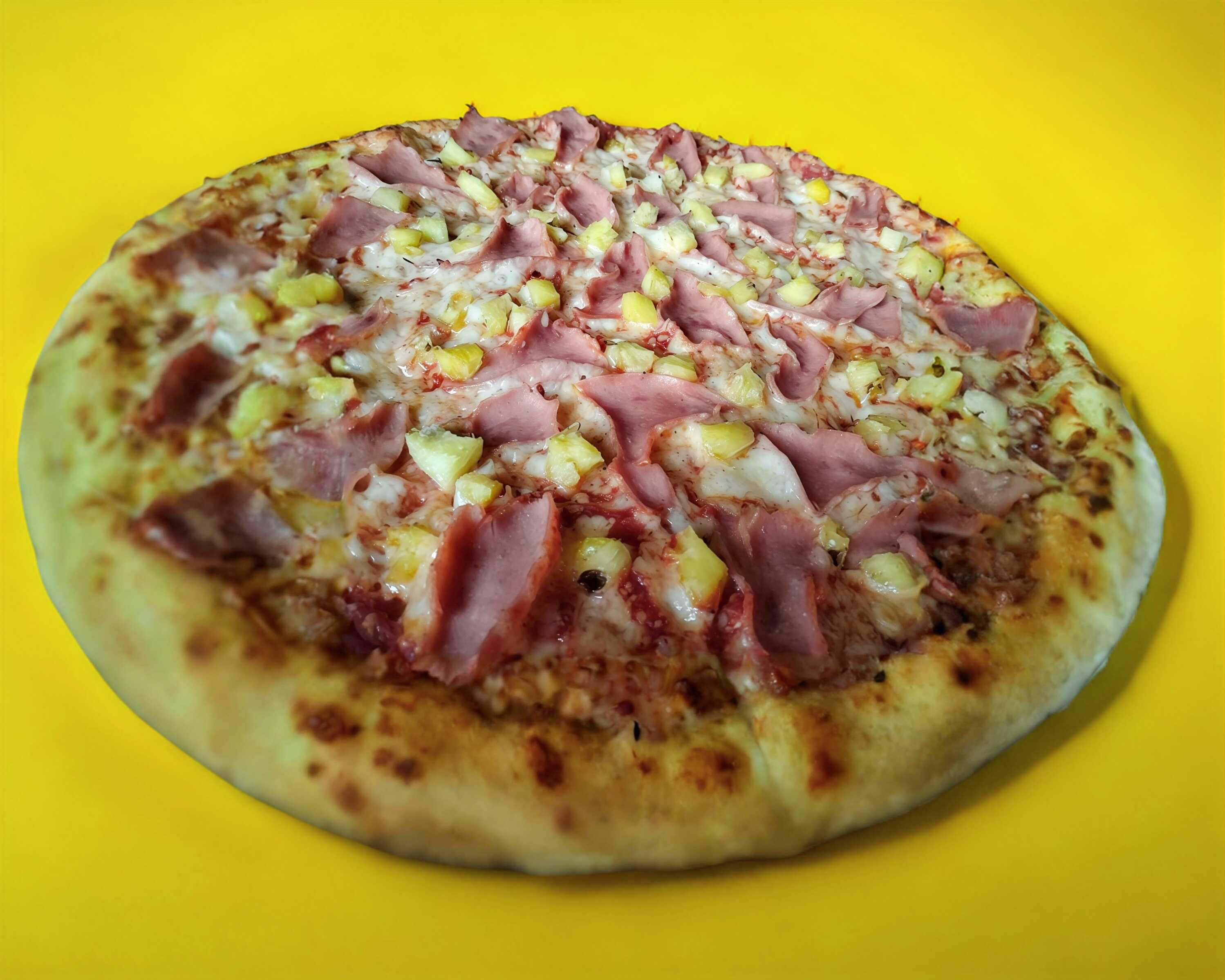 Pizza mediana con base de masa para pizza, salsa de jitomate, especias, queso mozzarella y Jamon,Piña