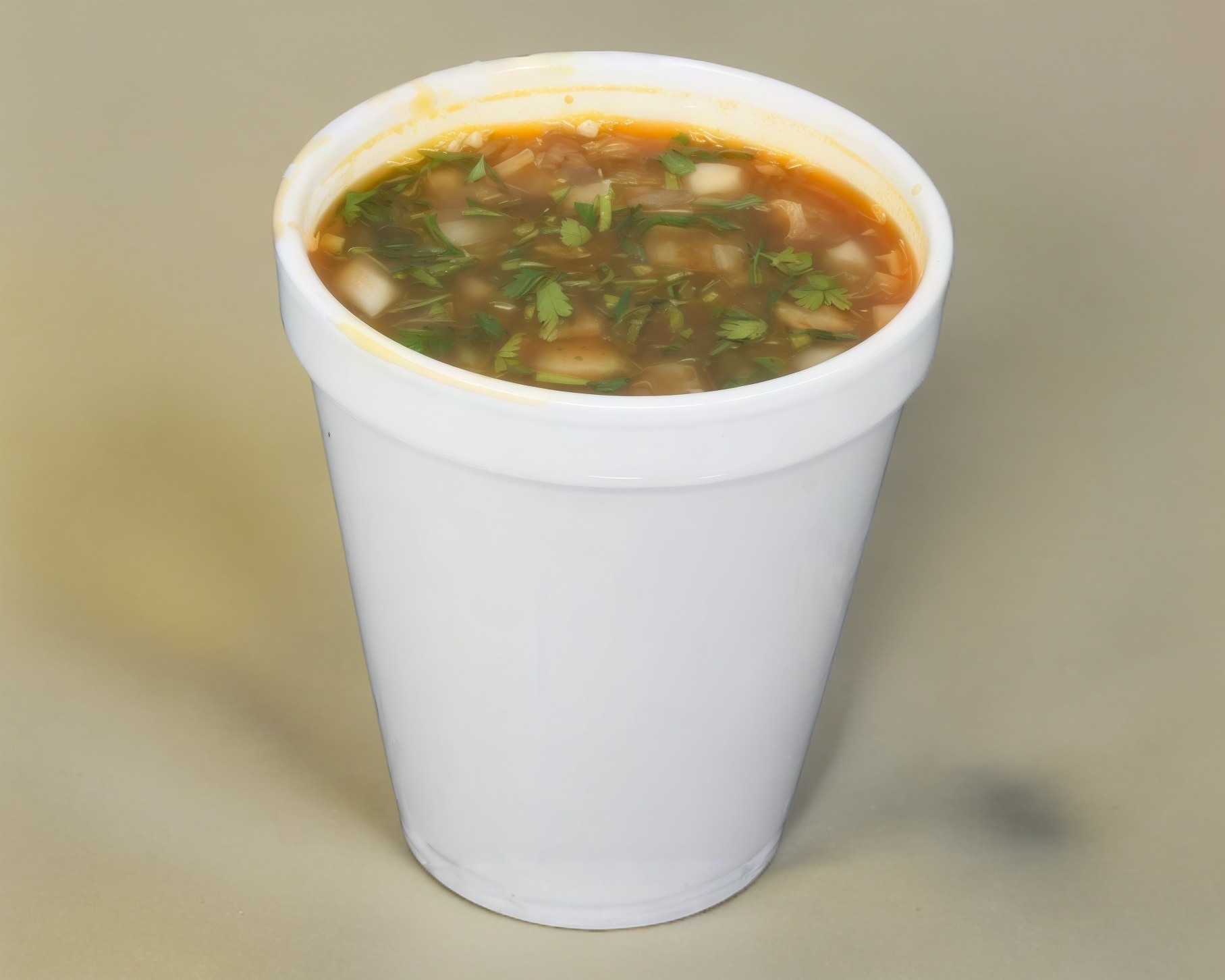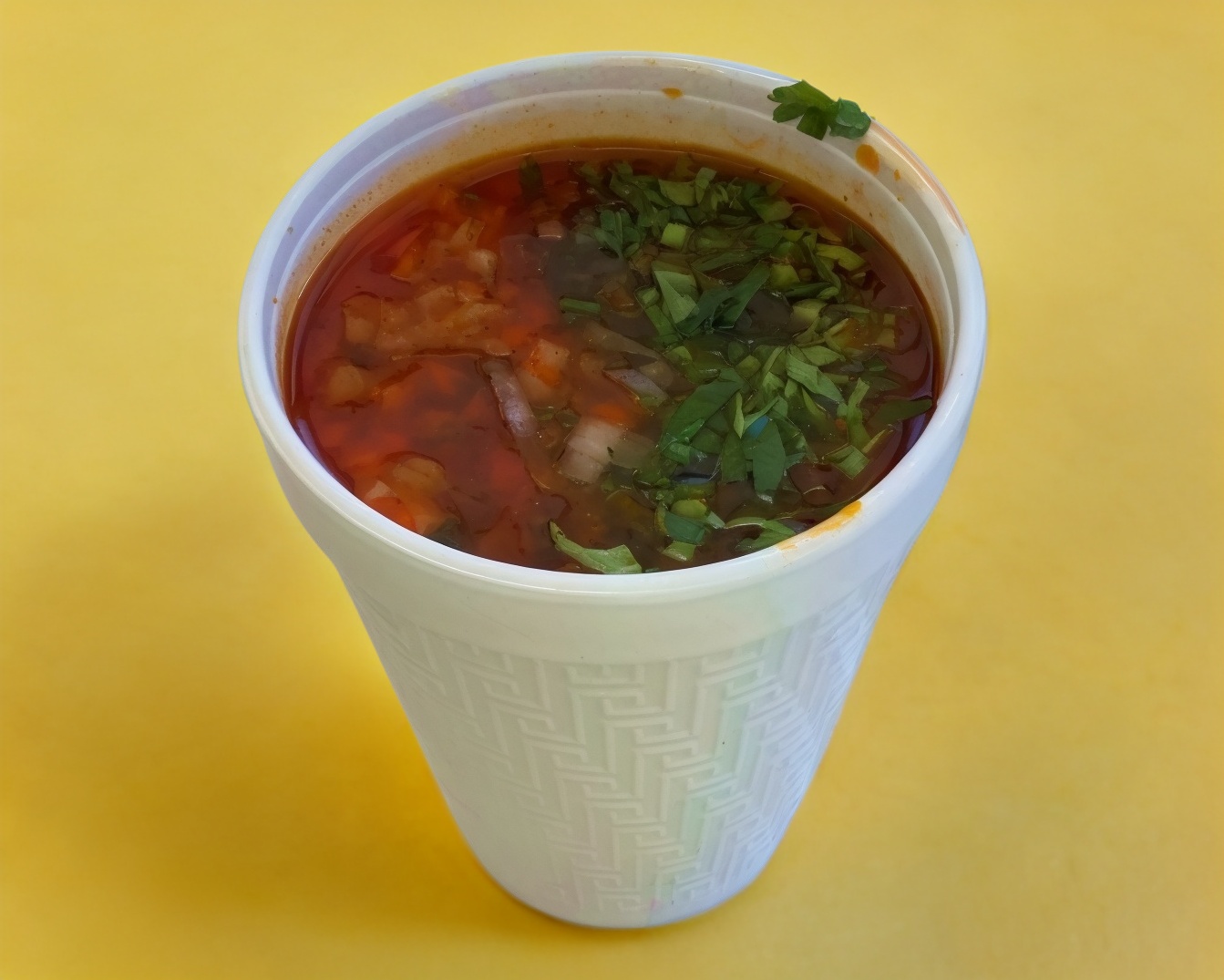 Consomé de birria en vaso de 8 onzas, acompañado de su verdura y picante.