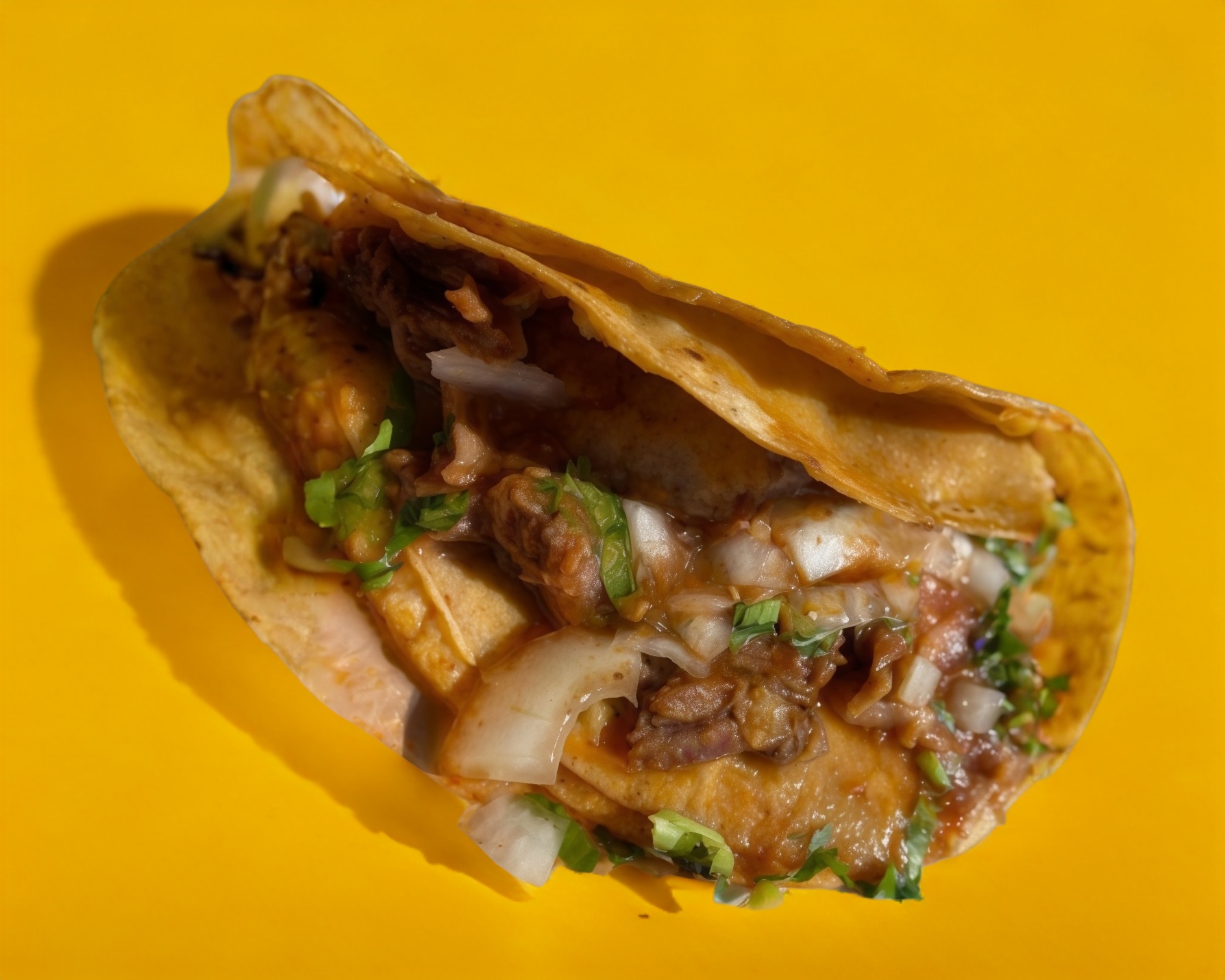 Taco en doble tortilla taquera de maiz, a la plancha con aceite natural de la carne. Por unidad.