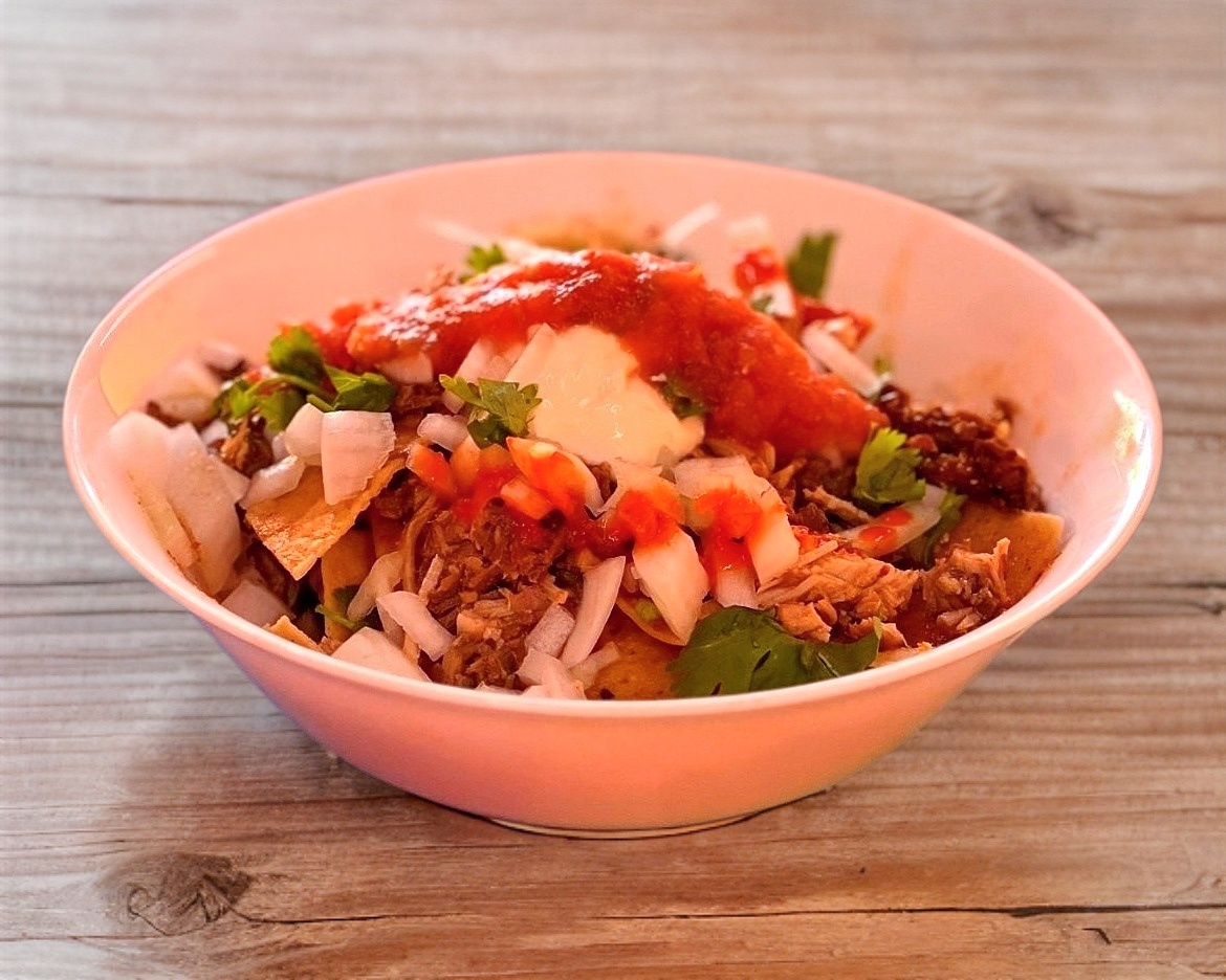 chilaquiles, birria, cilantro, cebolla, salsa del charro, salsa picante, queso