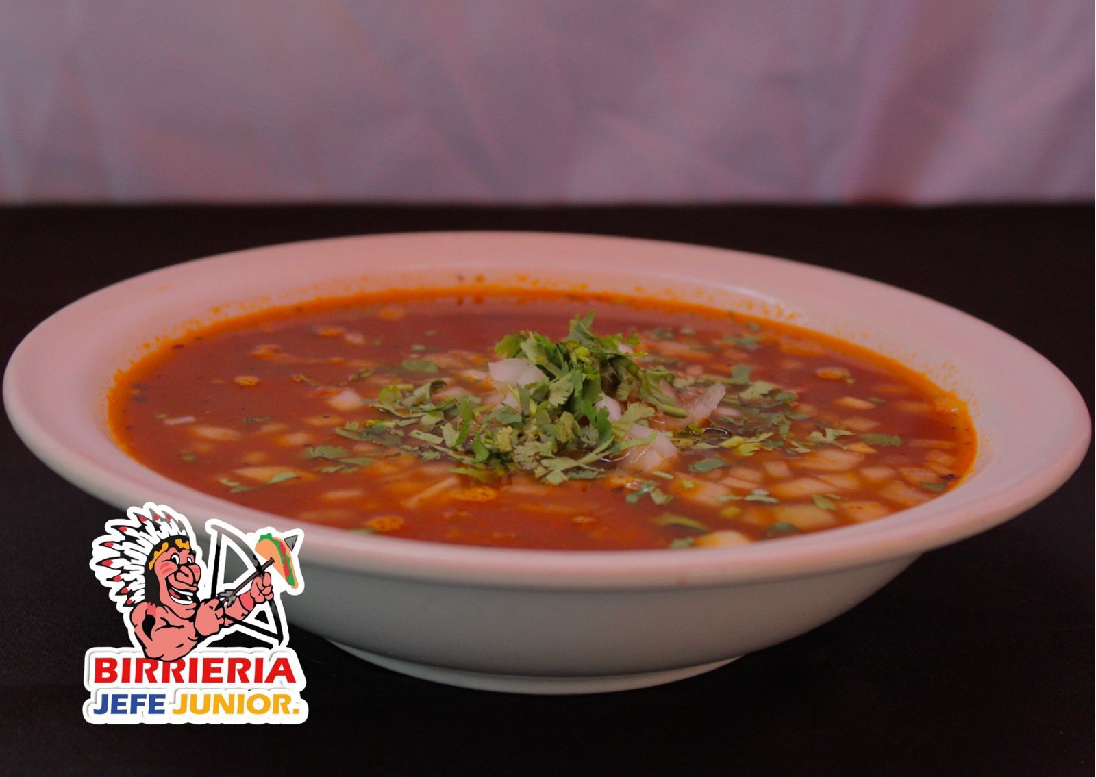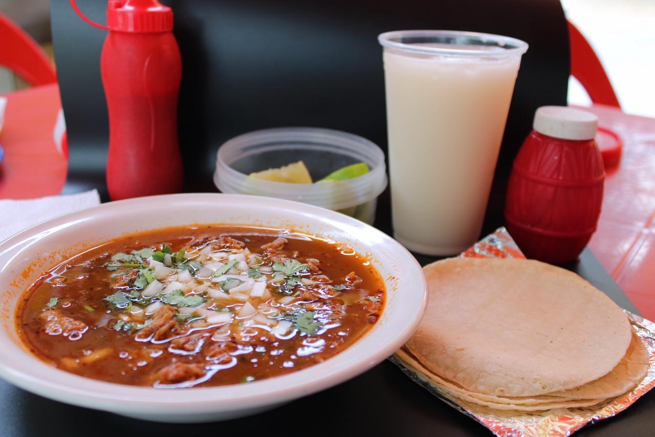 Caldo de birria con carne deshebrada.