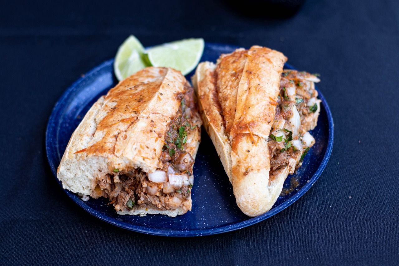 Pan relleno de birria jugosa y acompañamientos.