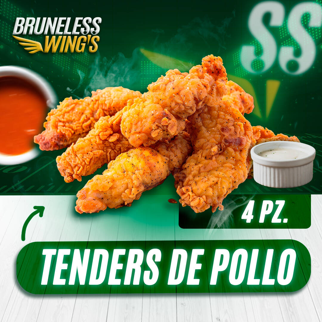4 Tenders de pechuga jugosa por dentro doradita por fuera... tú decides cómo disfrutarlos.. Originales crujientes , con salsa para dippear en la salsa de tu elección!