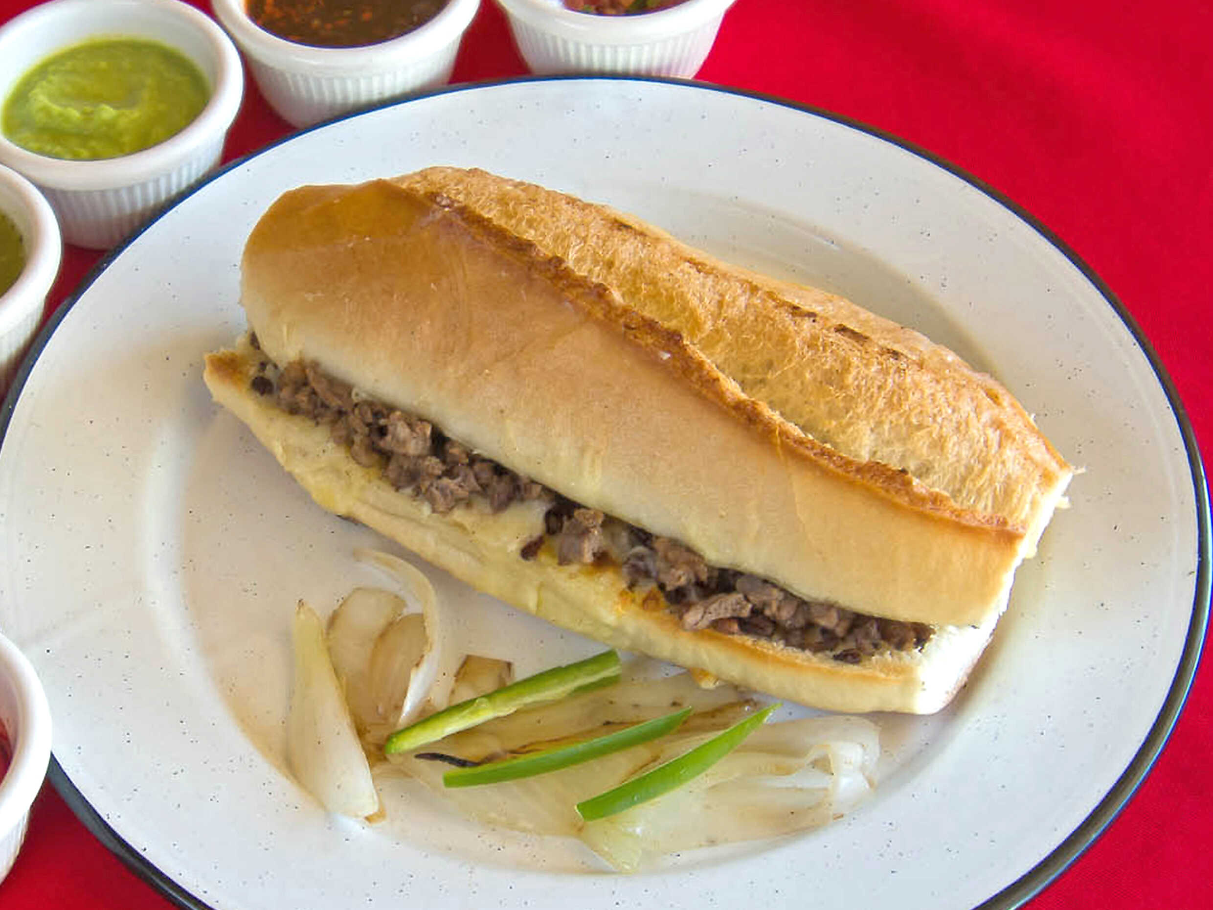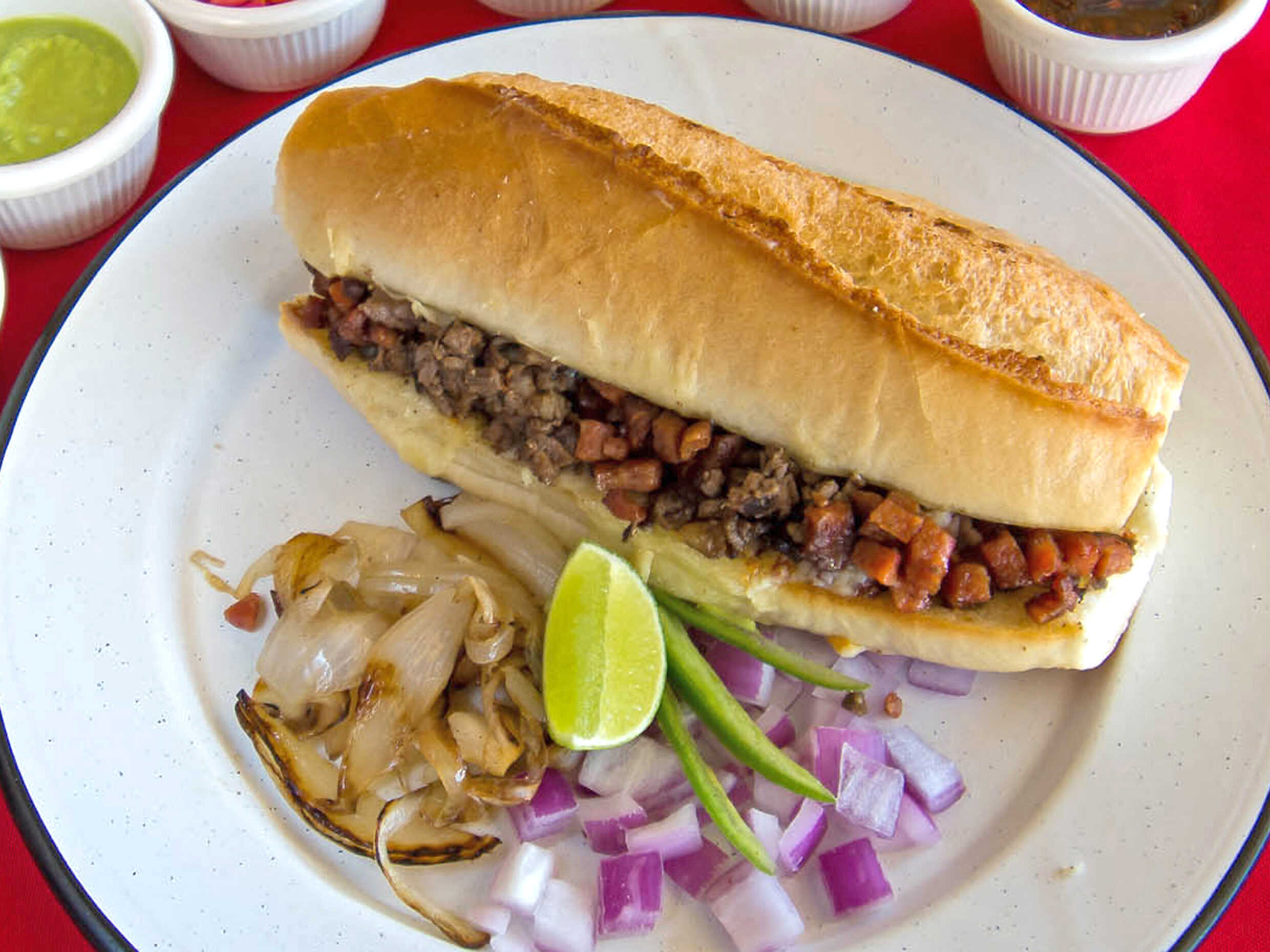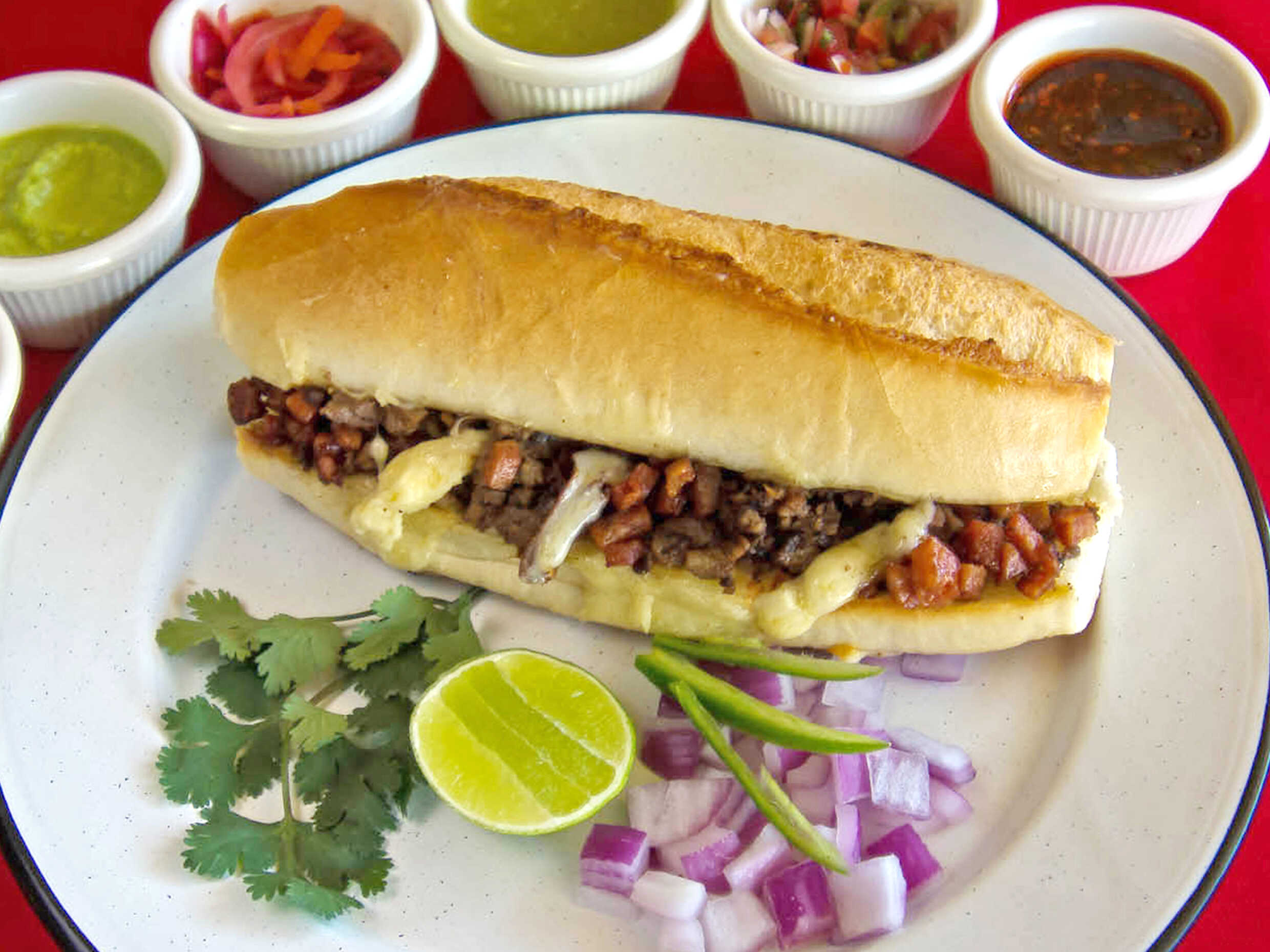 Bolillo grande con crema, mayonesa y carne asada con queso fundido. Cilantro, cebolla, limon y salsas aparte.