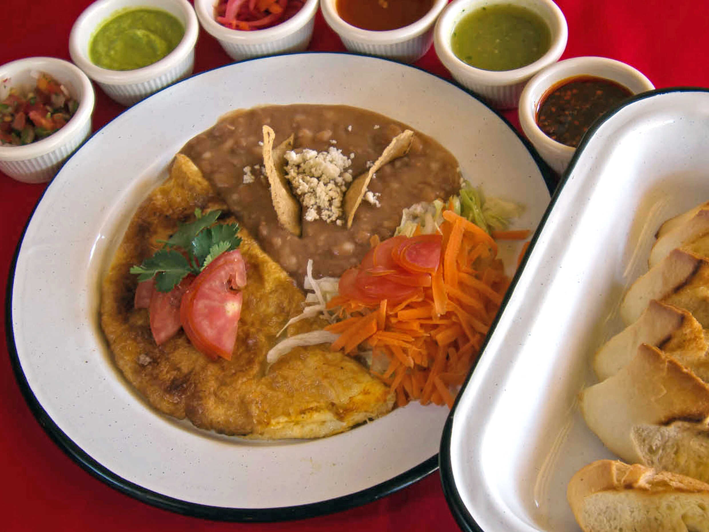 4 enchiladas en salsa roja de pierna de cerdo. Con crema y queso. Verdura, salsa suave y picante aparte.