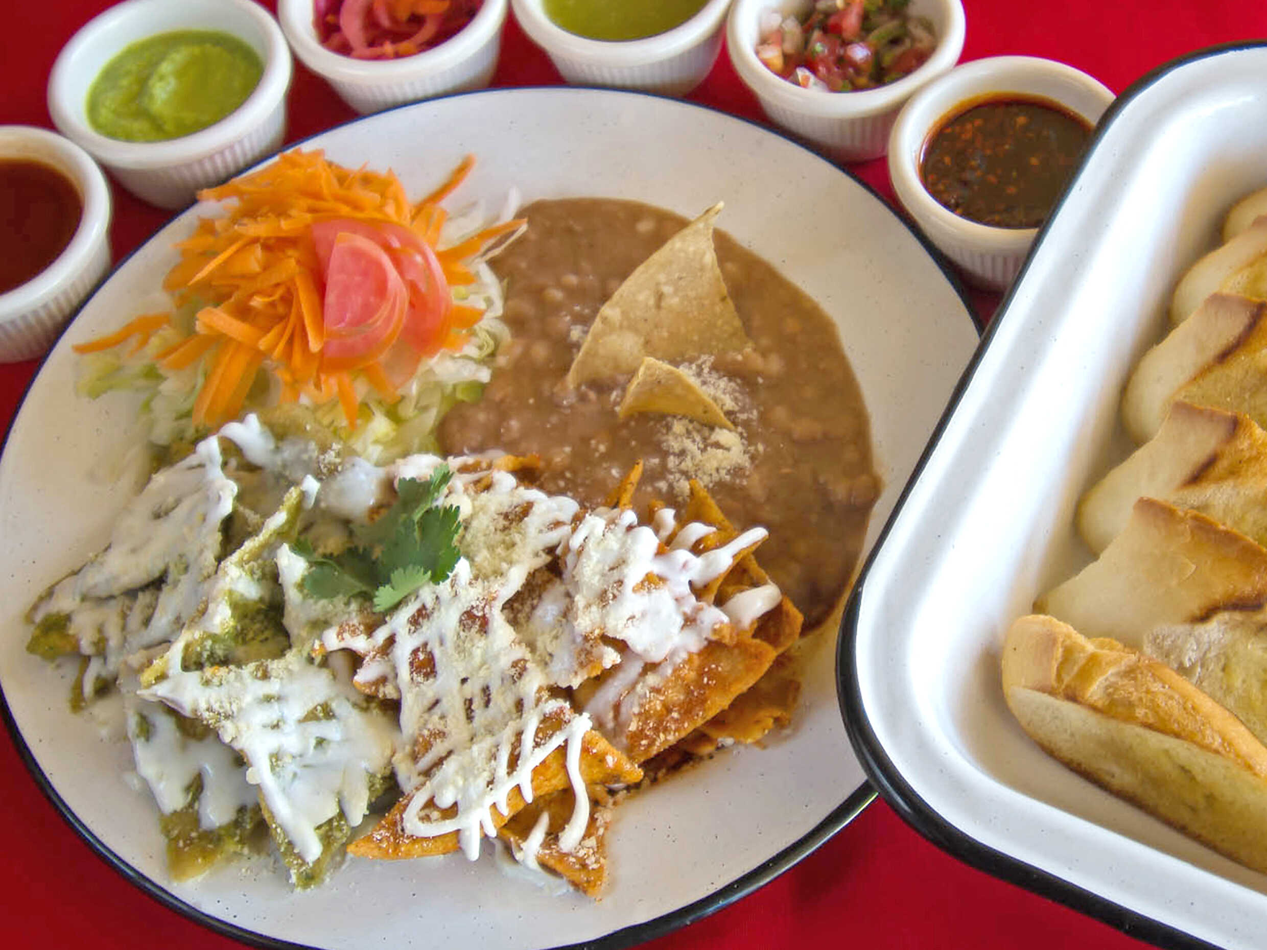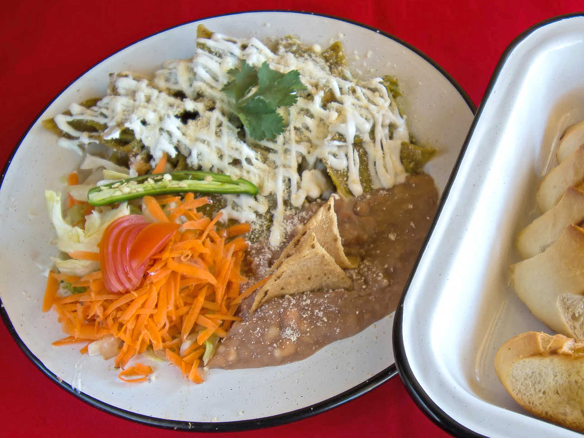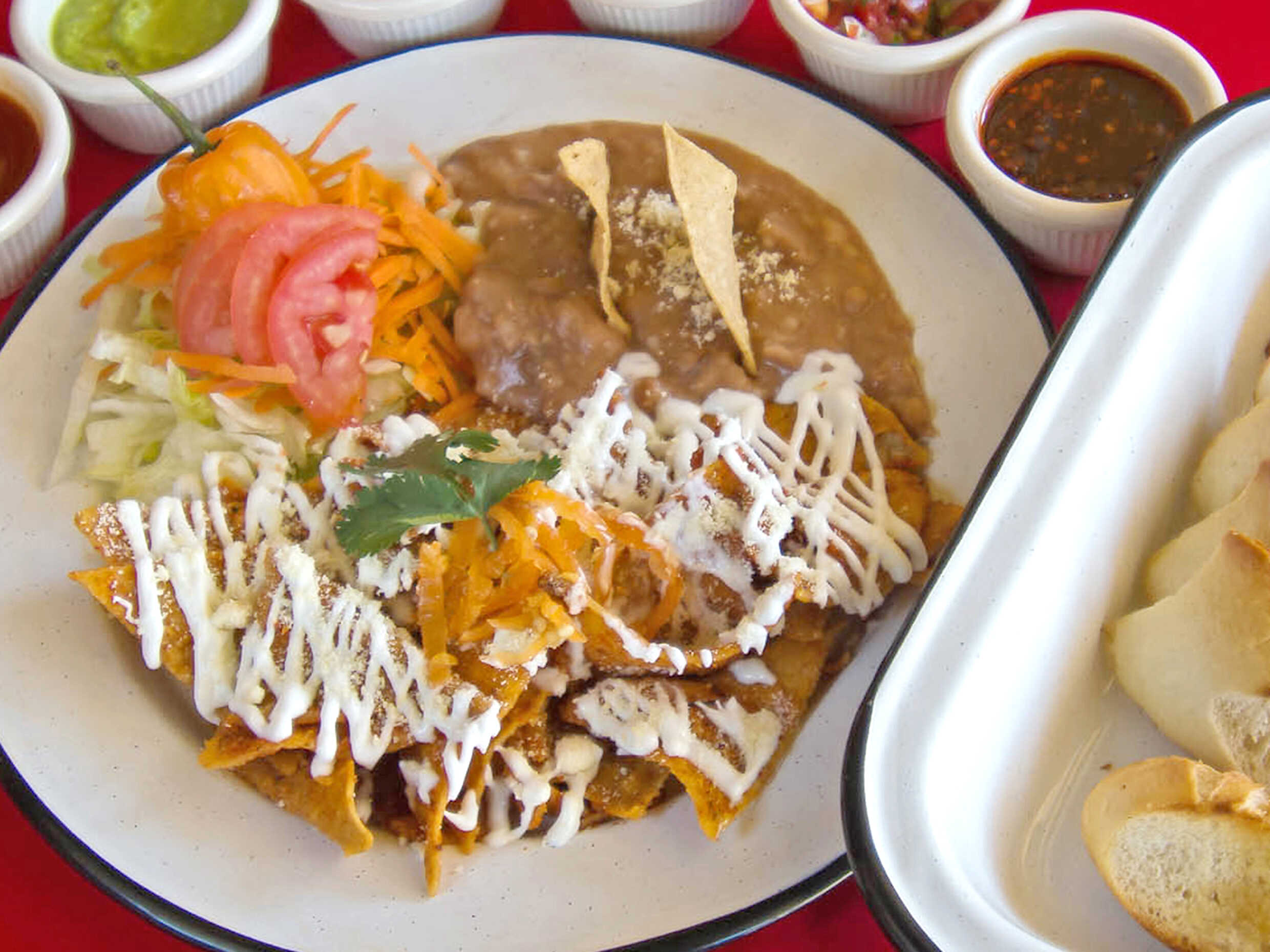Chilaquiles en salsa picosa, servidos con crema y queso. Acompañados de frijoles.
