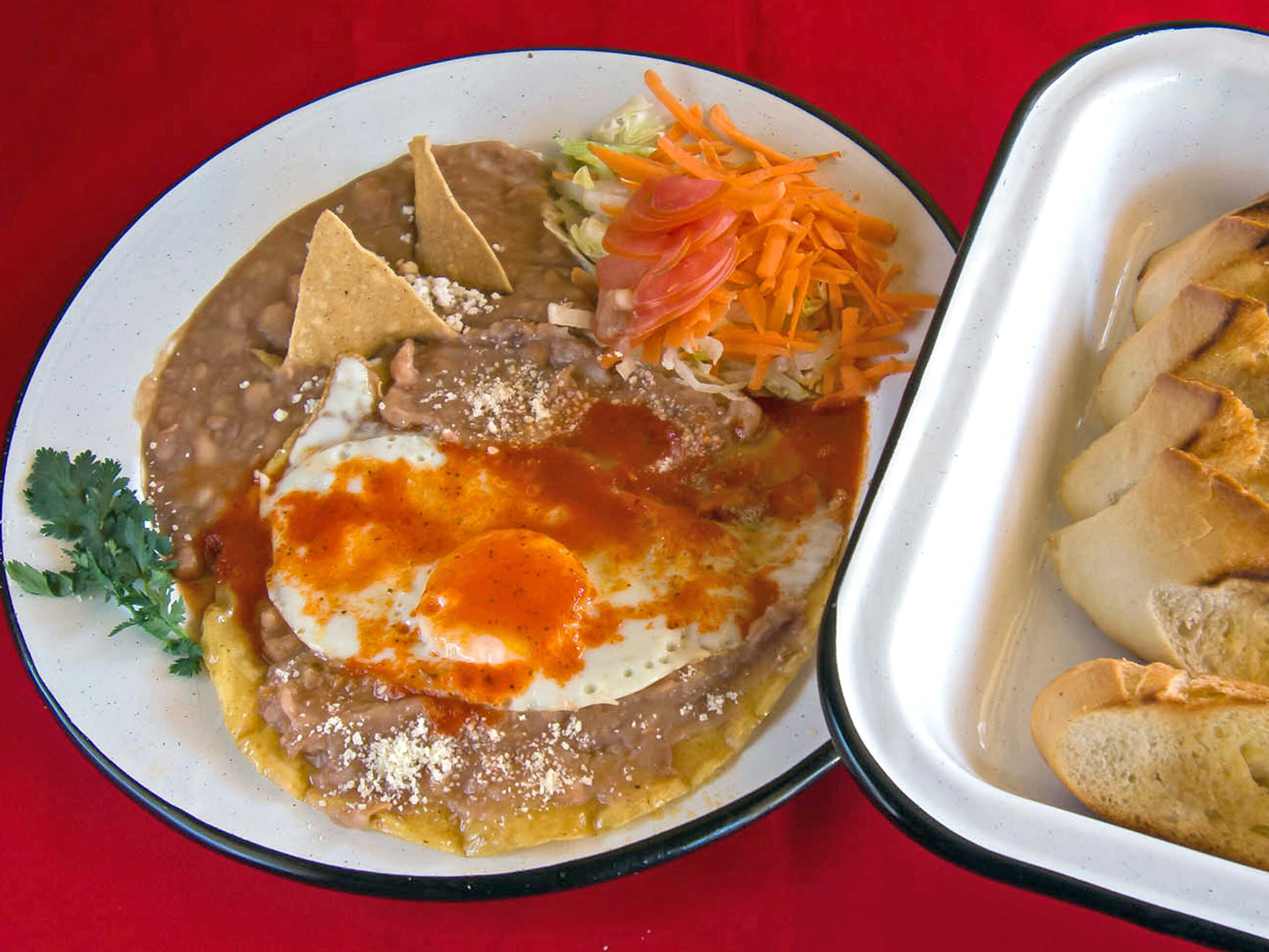 Dos huevos estrellados montados sobre tortilla y bañados con una salsa de jitomate casera. Acompañados frijoles. Bolillos sejuto a disponibilidad.