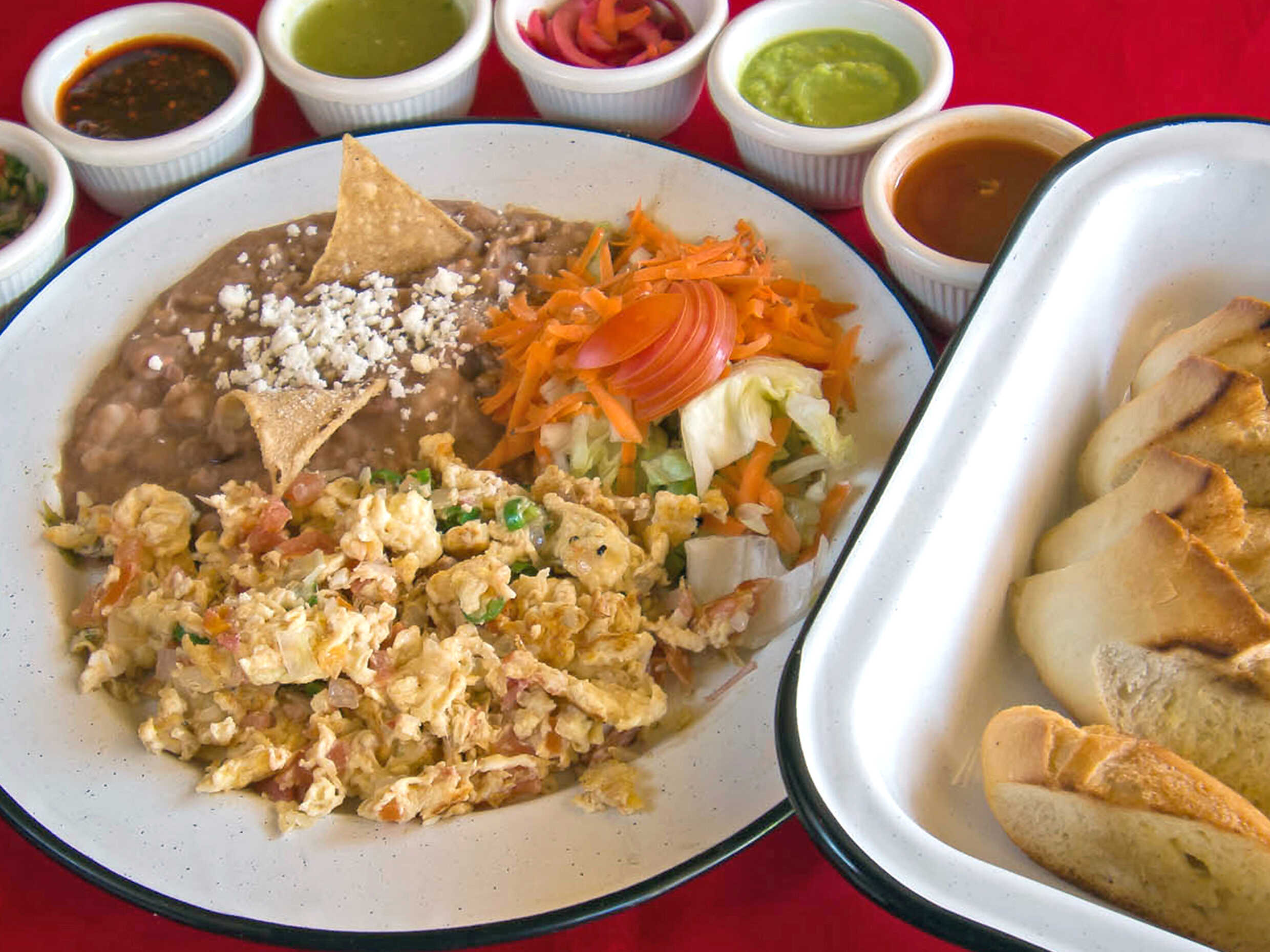 Dos Huevos revueltos. Acompañados con frijoles con queso. Bolillos dividido en 3 sujeto disponibilidad. + Salsa picante .