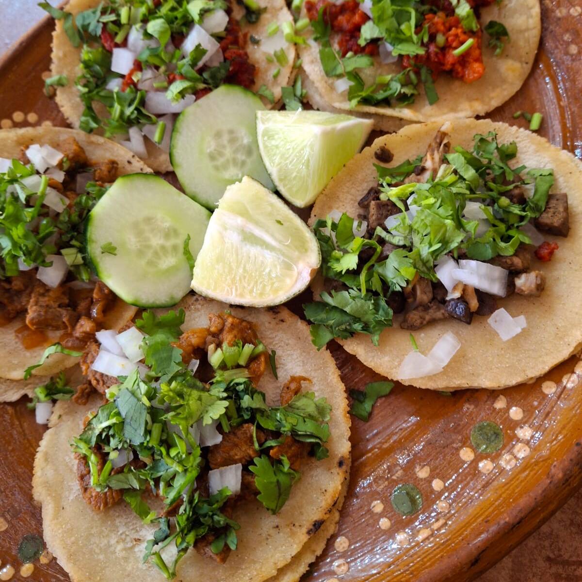 Orden de 5 tacos chicos con doble tortilla de chorizo casero. Con ciilantro, cebolla y limon. Salsas aparte