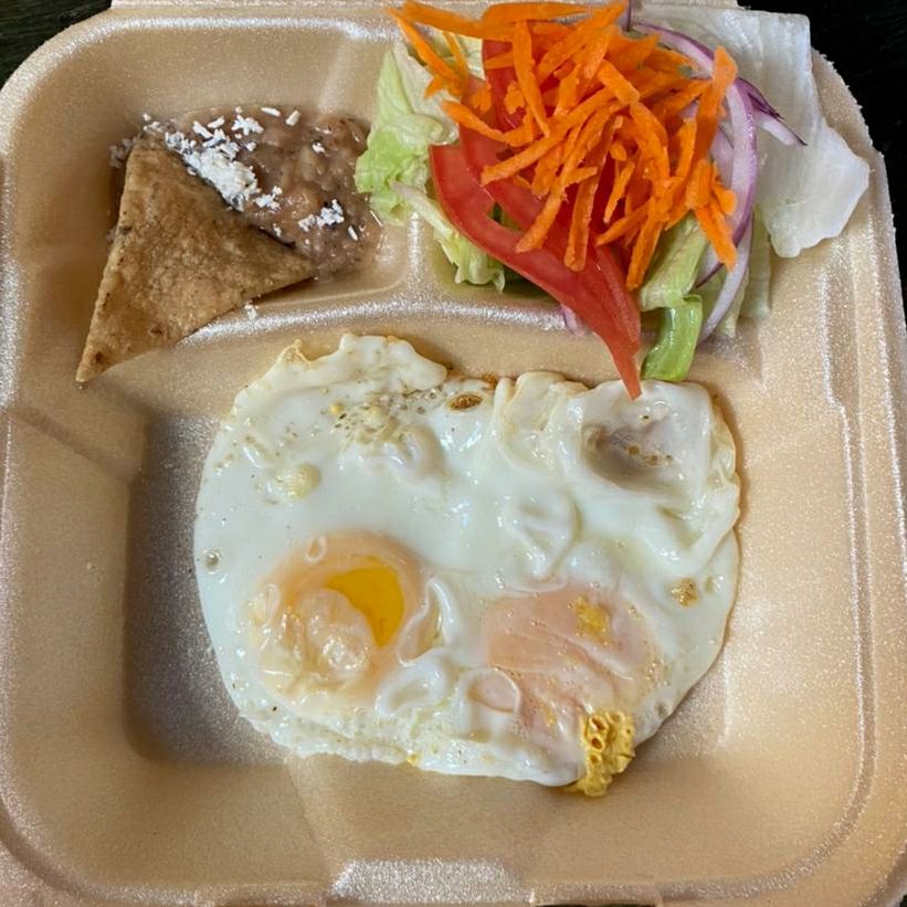 Huevo estrellado montados sobre 1 tortilla con frijoles, ensalada y salsa suave. Bolillo y salsa picante a parte.