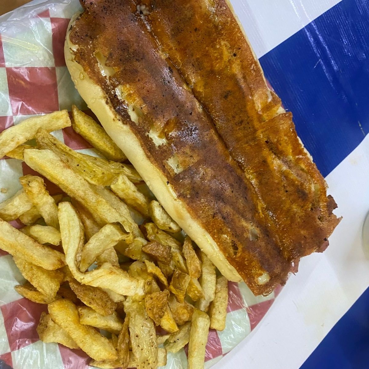 (carne, pimiento morrón, camarón, tocino y queso asadero)