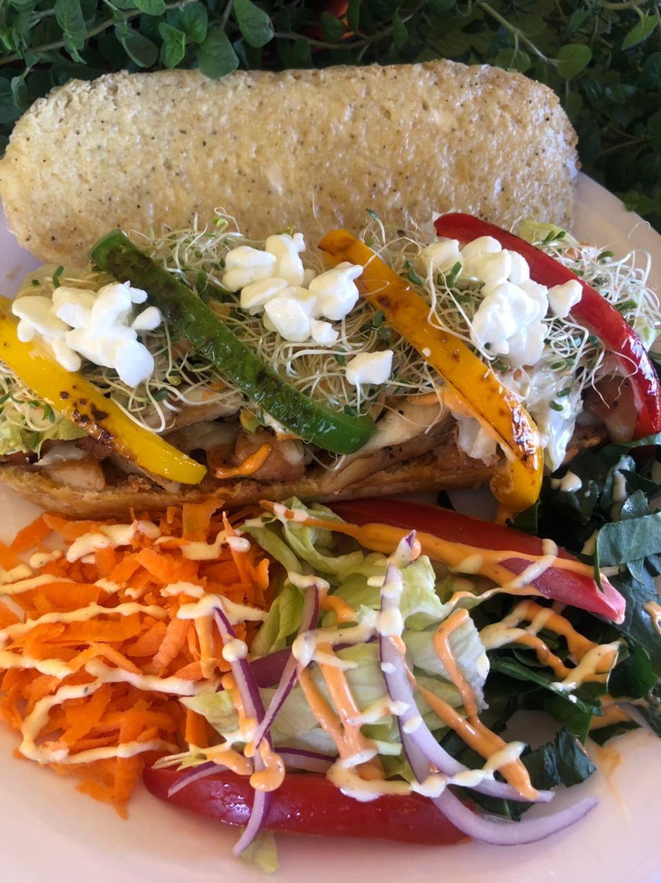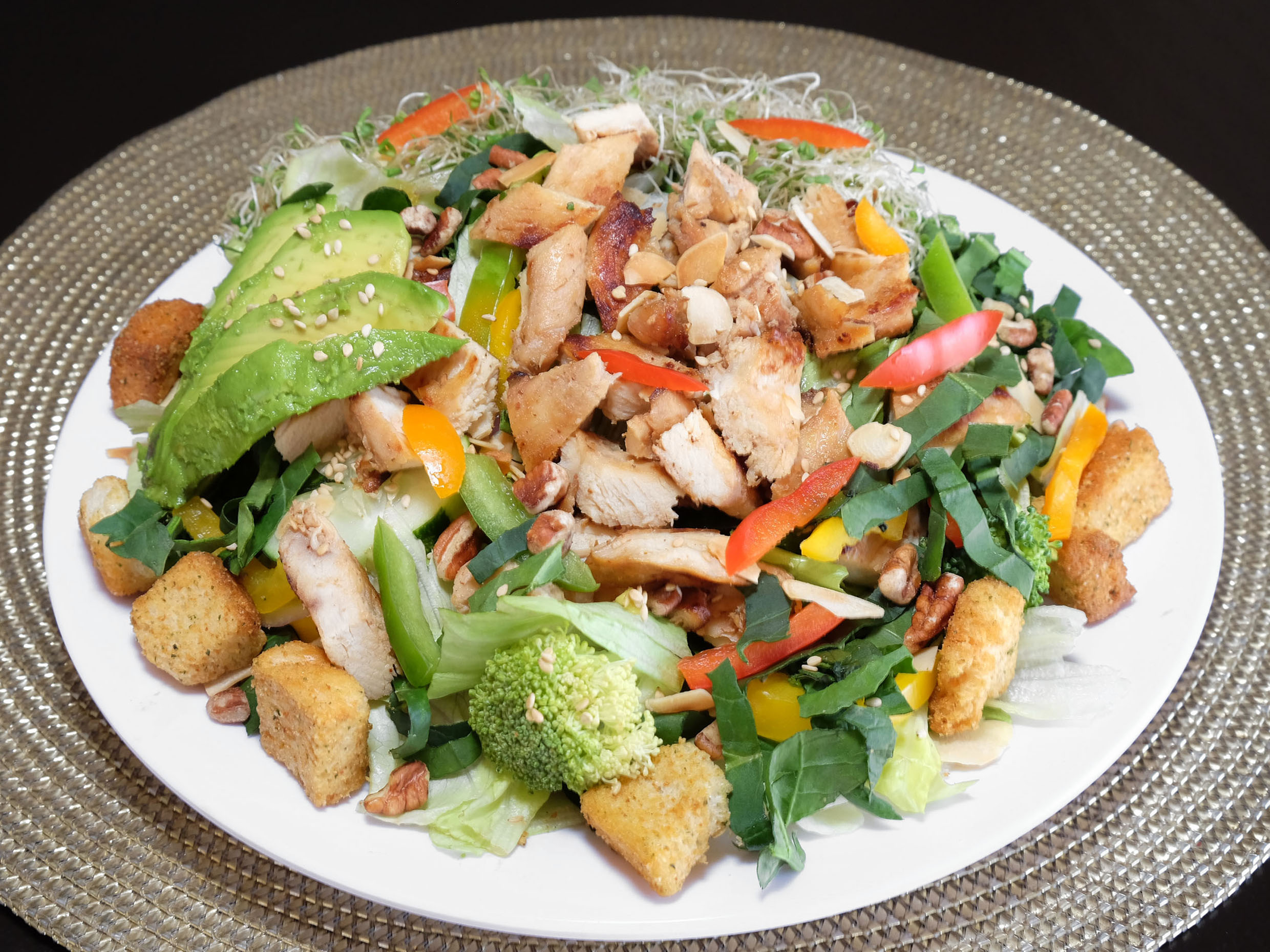 pechuga marinada con una base de lechuga romana y orejona pimientos ,germinado,pepino cebolla ,aguacate ajonjoli,queso parmesano y aderezos de la casa.
