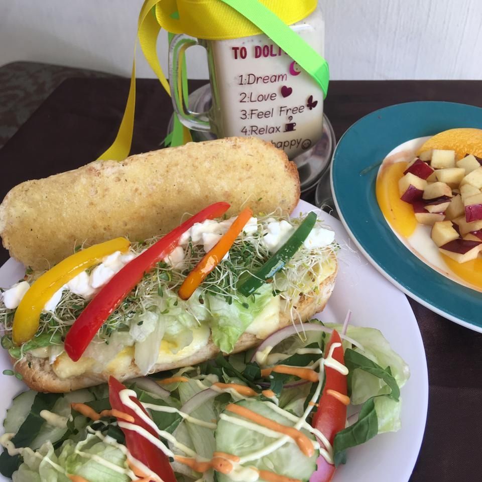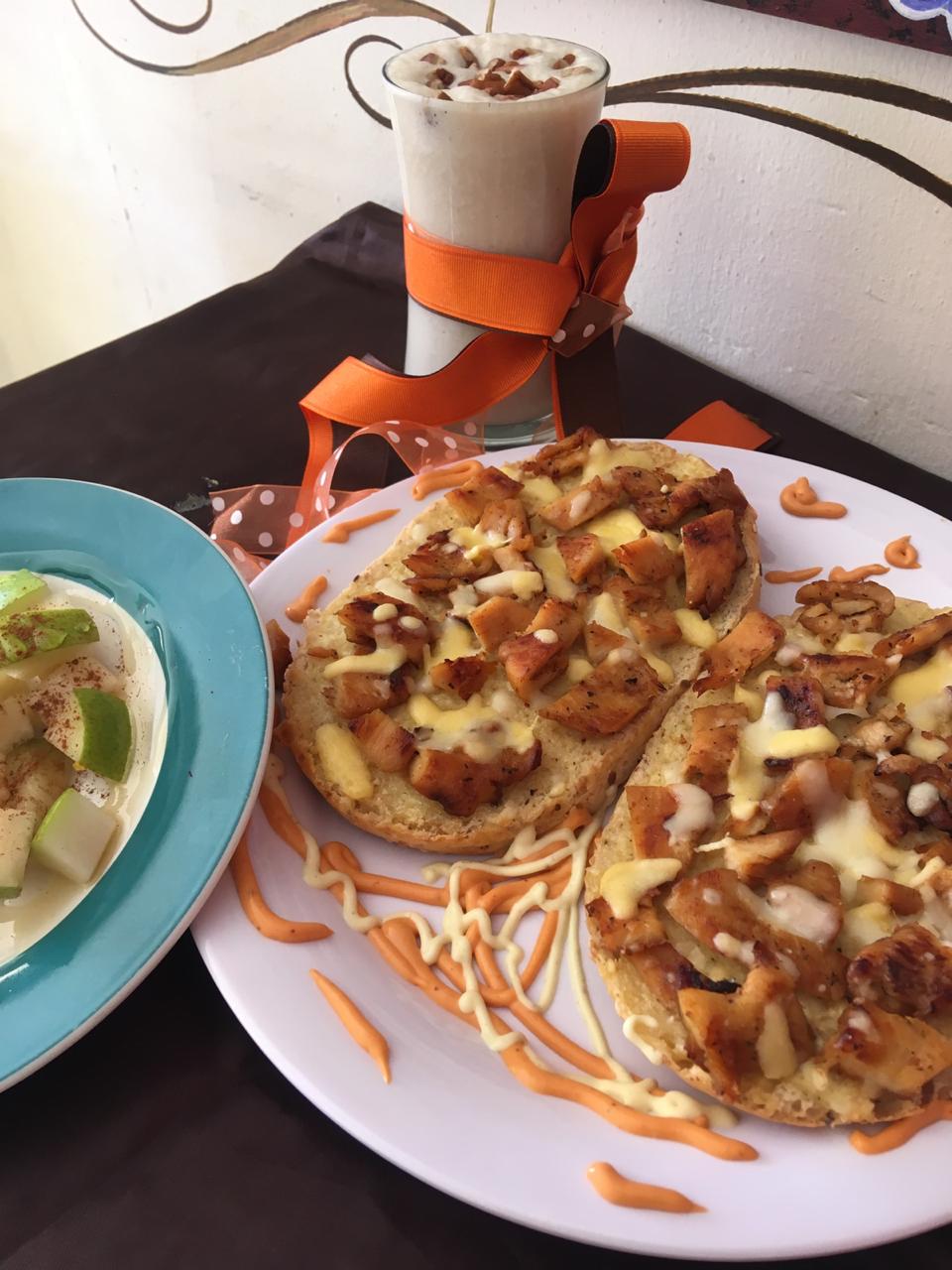 pan integral,panela,lechuga,romana,jitomate,cebolla,germinado,aguacate,aderezos de la casa.