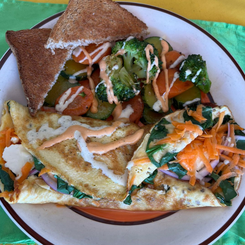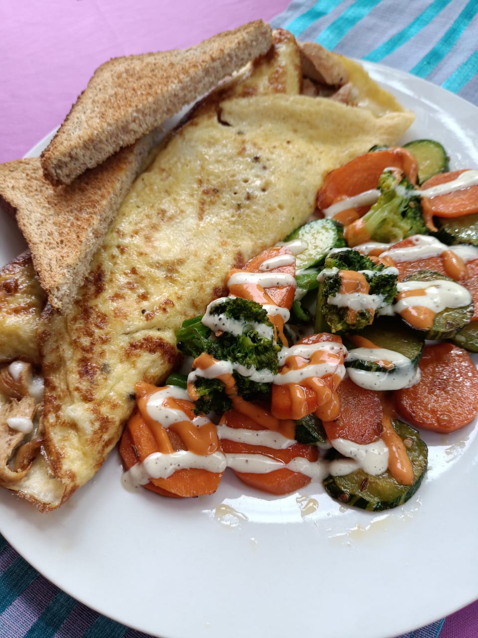 Omelette acompañado de vegetales a la mantequilla frijoles guisados y pan tostado