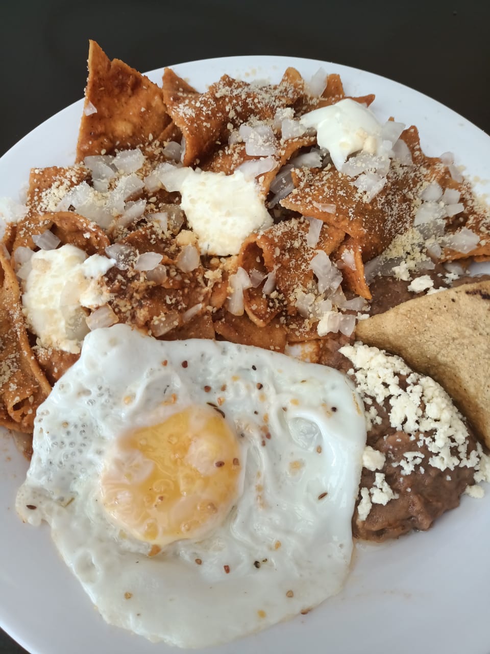 incluye chilaquiles rojos con crema cebolla y queso parmesano y frijoles guisados