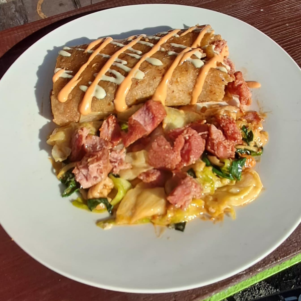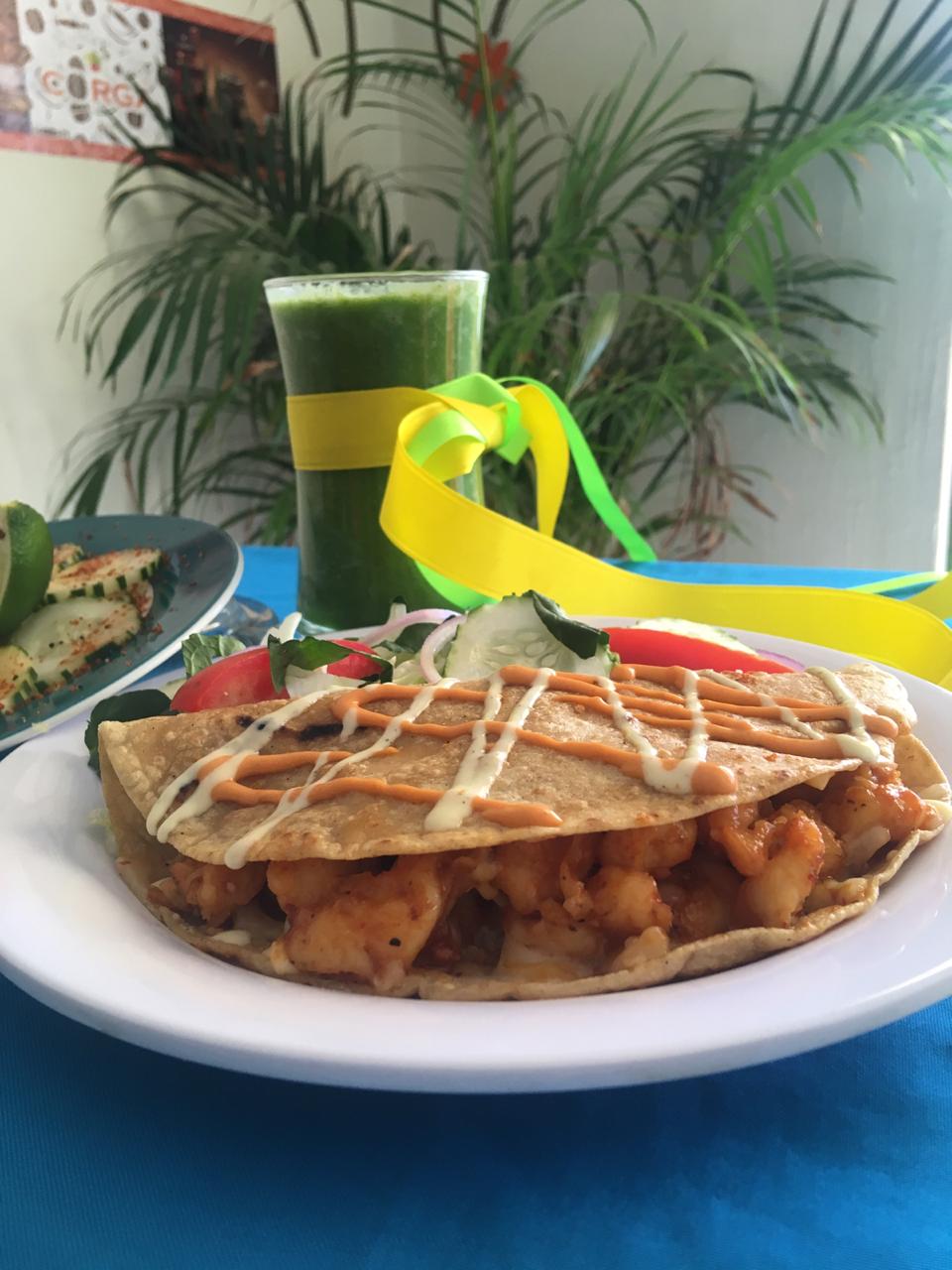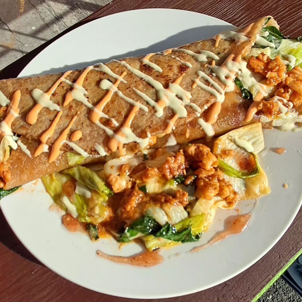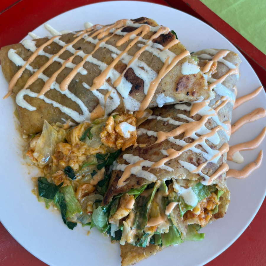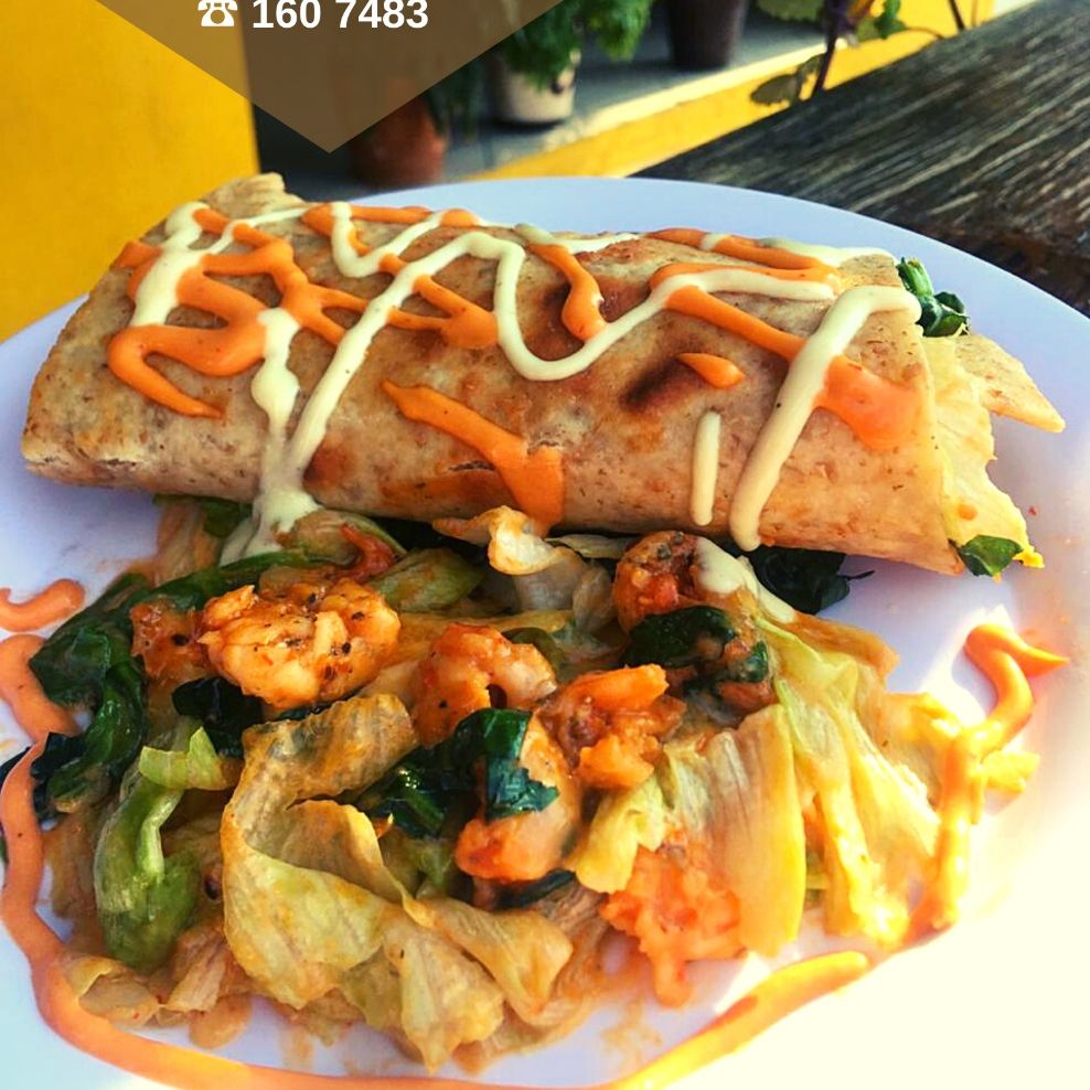 base de lechuga espinaca,queso cheddar,camaron aderezos de la casa envueltos en tortilla hecha a mano 100% corga.