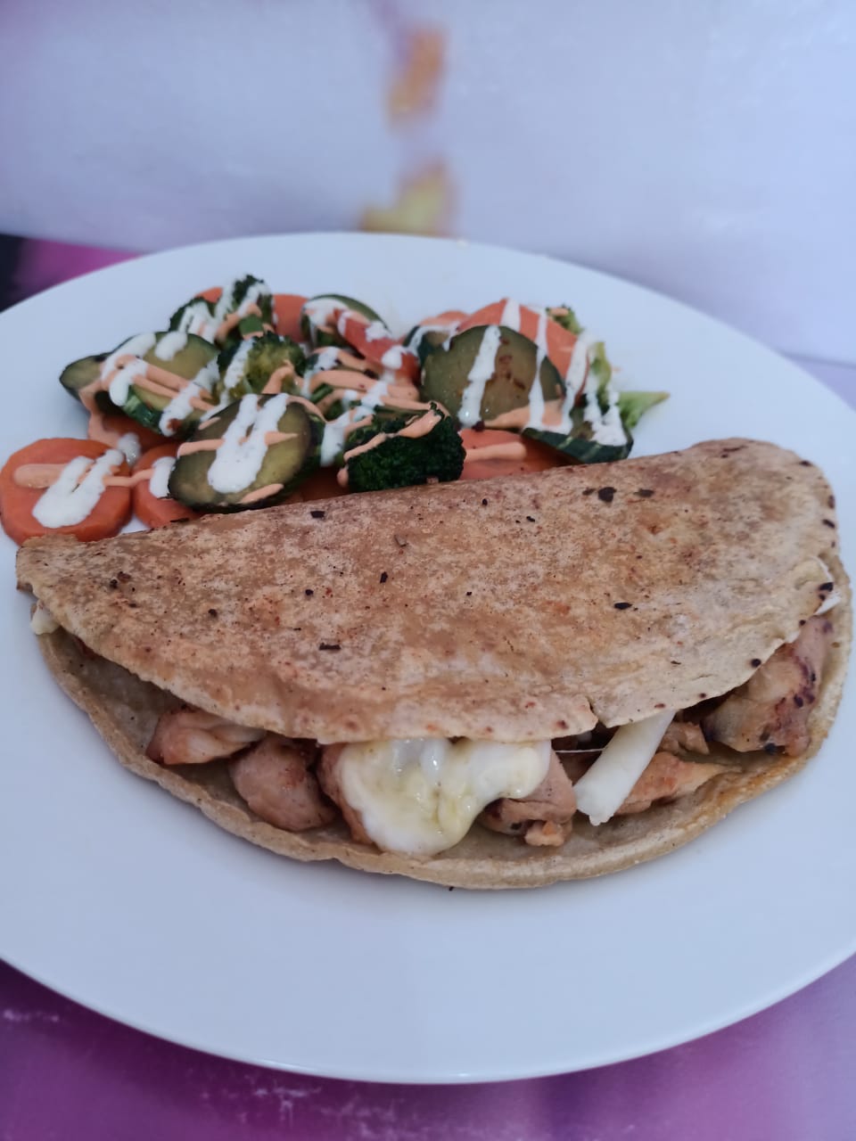 panela queso cheddar tortilla de maiz Acompañada de vegetales al vapor.