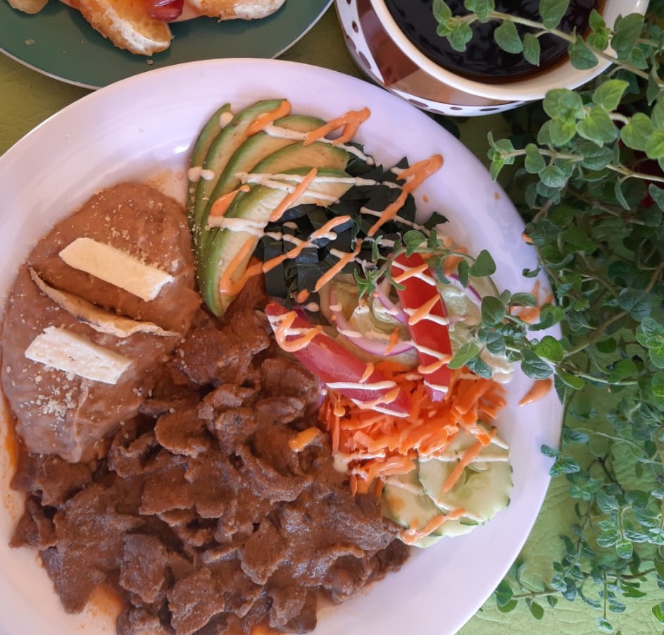 200gr de carne acompañado de frijoles guisados, tortillas ,aguacate y ensalada fresa.