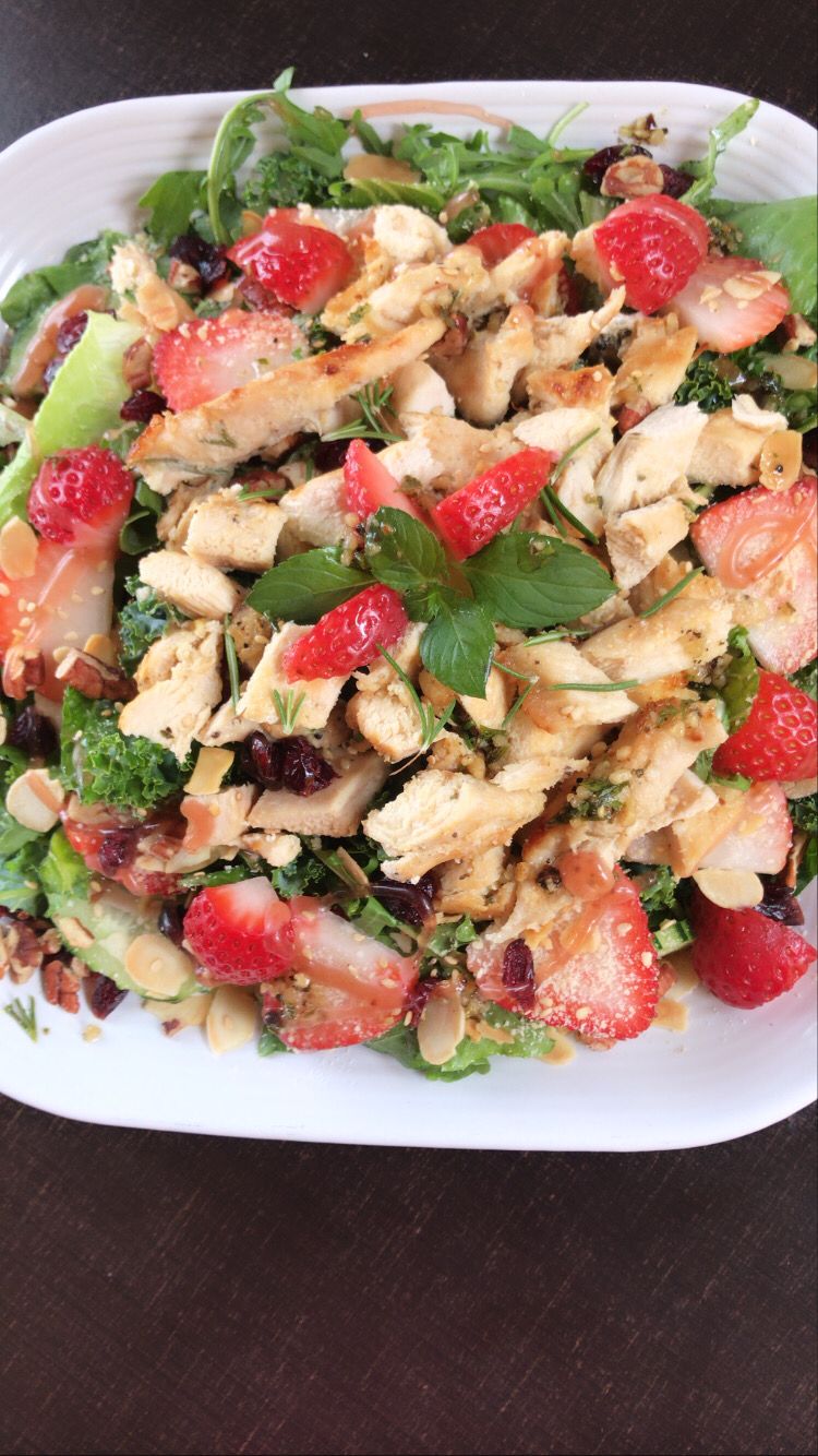 200gr de pechuga marinada en hierbas finas con base de lechuga orejona y romana,espinaca,arandano,fresa,nuez,alemendra,vinagreta de hierbas finas con aceite de olivo.