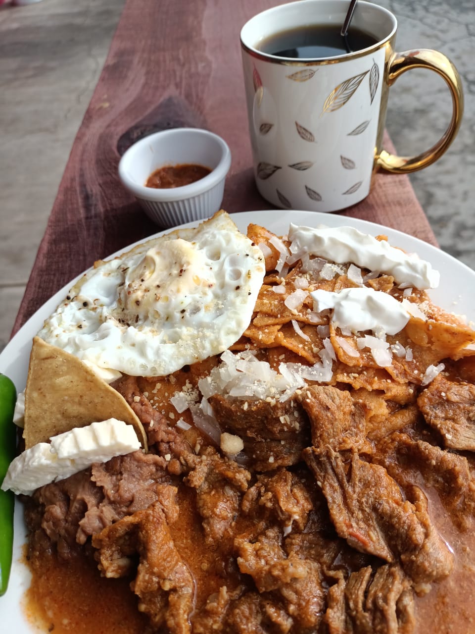 200gr de Carne con chile acompañado de chilaquiles rojos y frijoles guisados , 1 huevo estrellado y cafe americano.