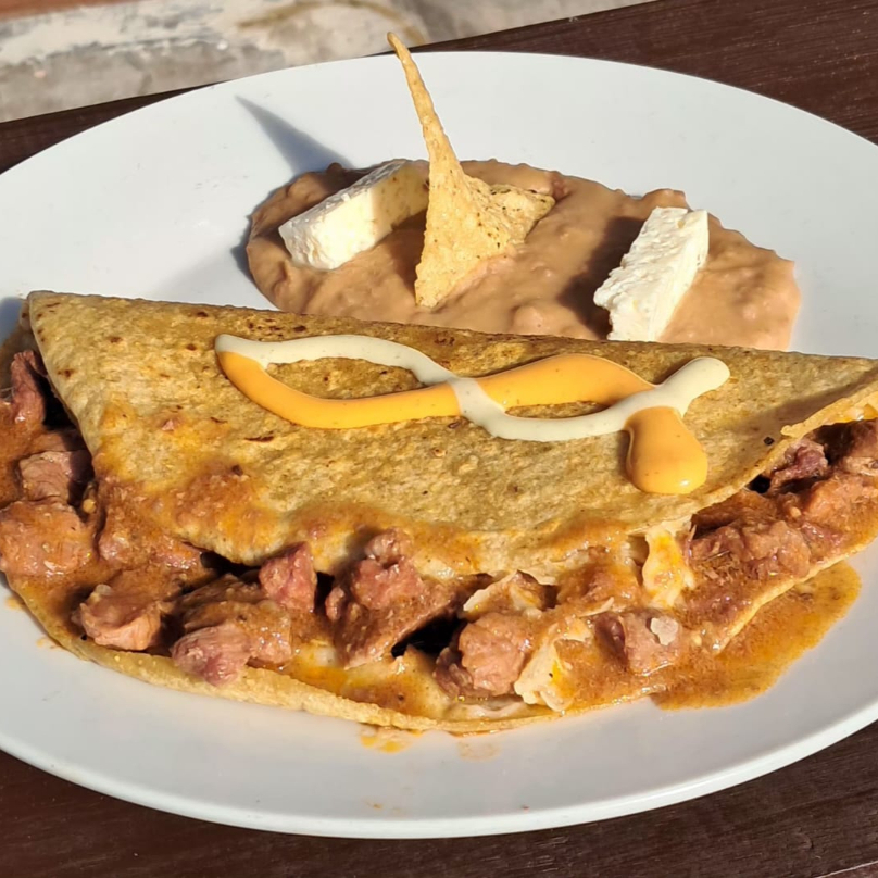 frijoles, pechuga marinada,queso cheddar,aderezos de la casa acompañado de salsa mexicana