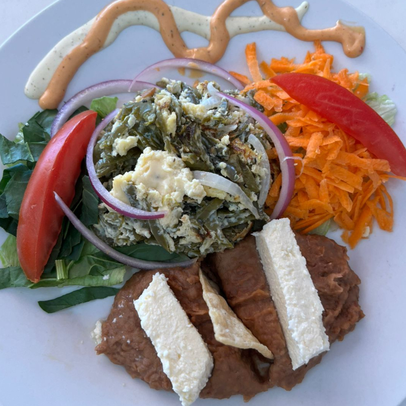 huevo con nopales acompañado de frijoles ensalada fresca, 2 tortillas de maiz