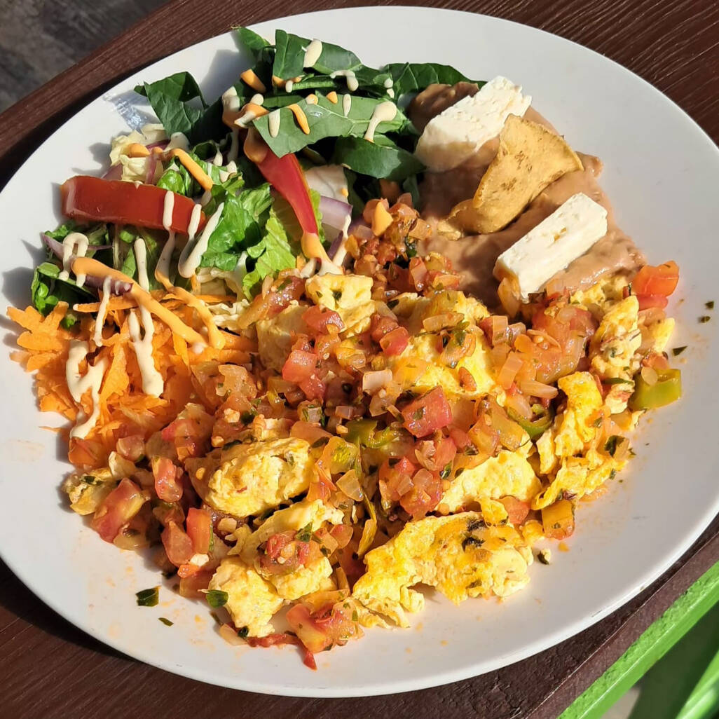 huevos con chorizo acompañado de frijoles y ensalada fresca y 2 tortillas de maiz